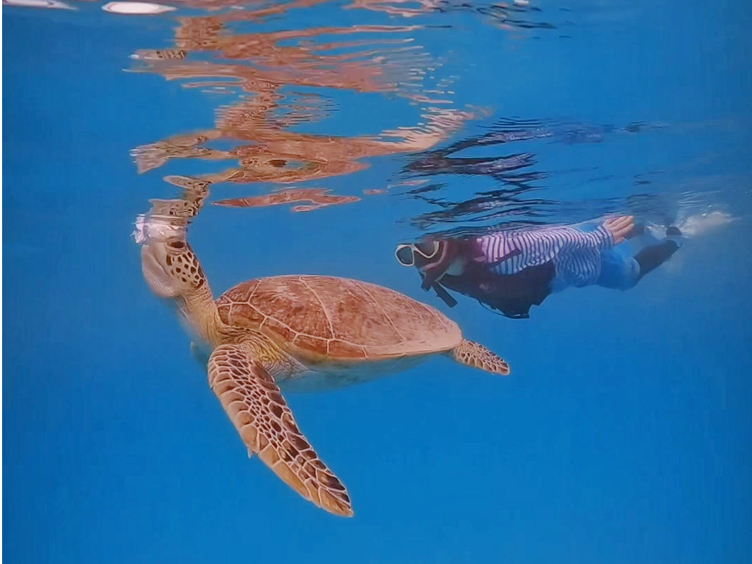 シュノーケルスポットをよくご存知なので、珊瑚の群生地で熱帯魚を見たり、白い砂地を優雅に泳ぐウミガメを見たりと大満足のシュノーケルでした。