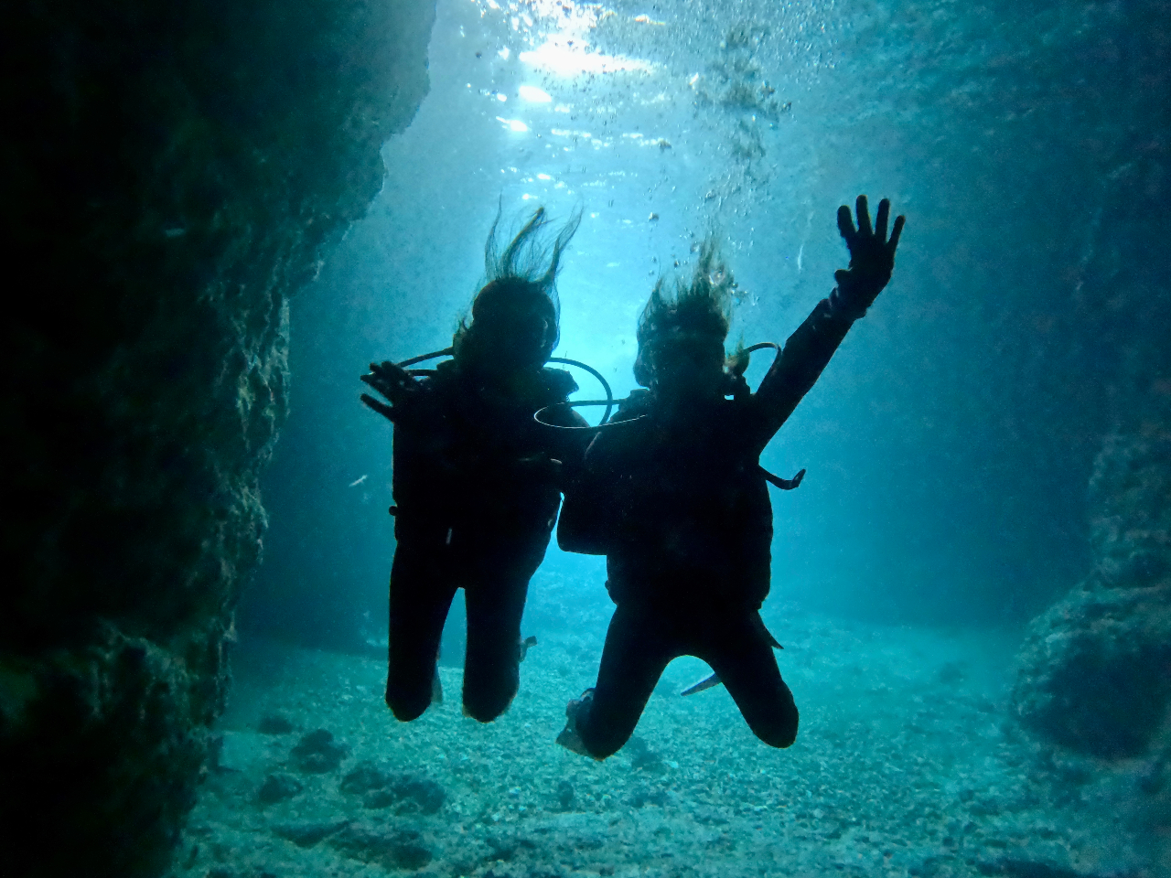 青の洞窟のダイビングに高校生と中学生の子供と母親の私の3人で参加しました。透き通った海、水族館で見る綺麗な魚たちがすぐ手の届くところを泳いでいて、幻想的な光景に感動の連続でした。本当に楽しかったです!!