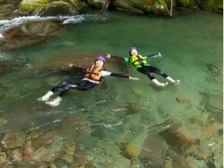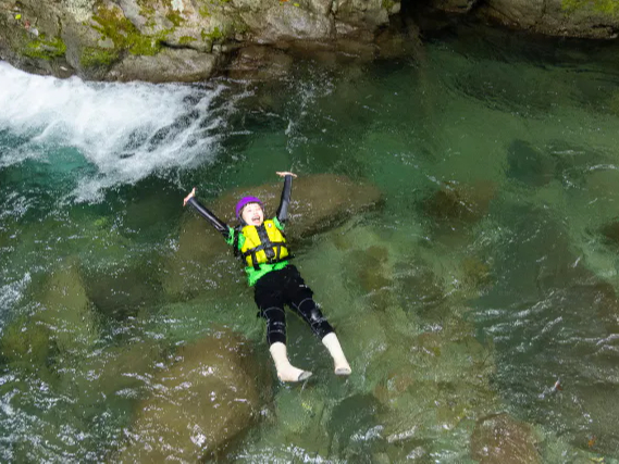 驚くほどの透明度の澄み切った川でシャワークライミング♪しっかり遊んだ後は地元産のお肉と野菜でおなか一杯に!心も体も満たされるプレミアムな体験♪沢登り(シャワークライミング)