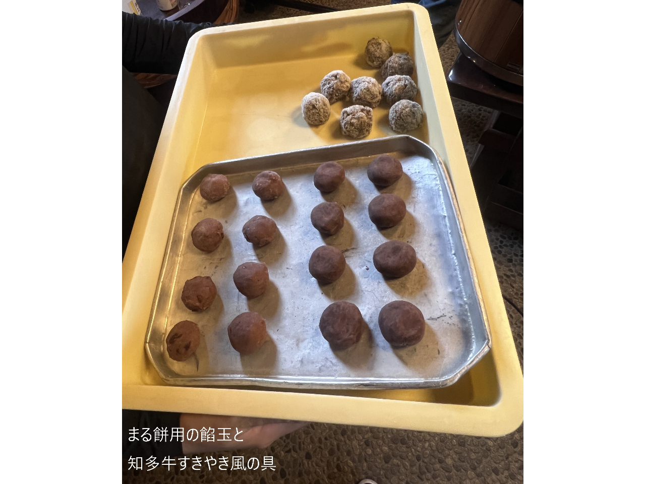 ・あん餅(粒あん、こしあん、知多牛すきやき風)…大蔵餅特製の餡やすきやき風の具をお餅で丸く包みます。コツを掴めば綺麗にできます!つまみ食いOK!
