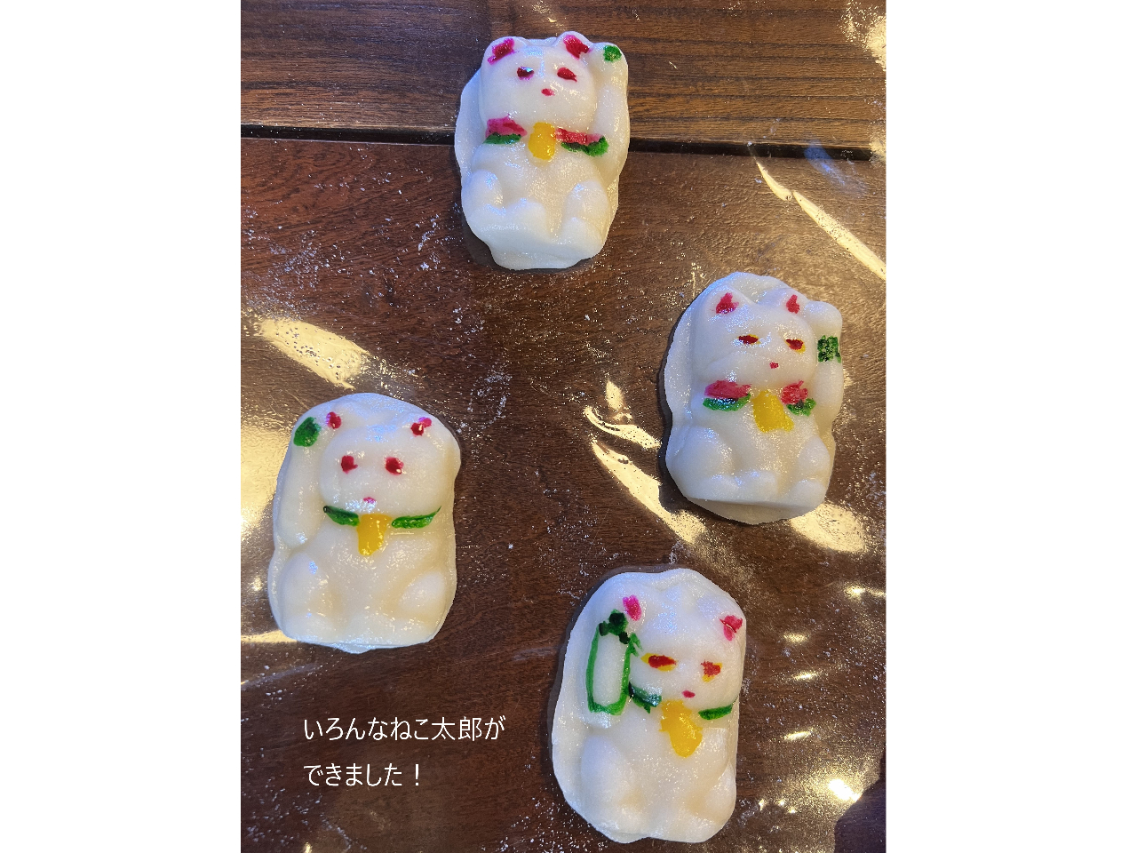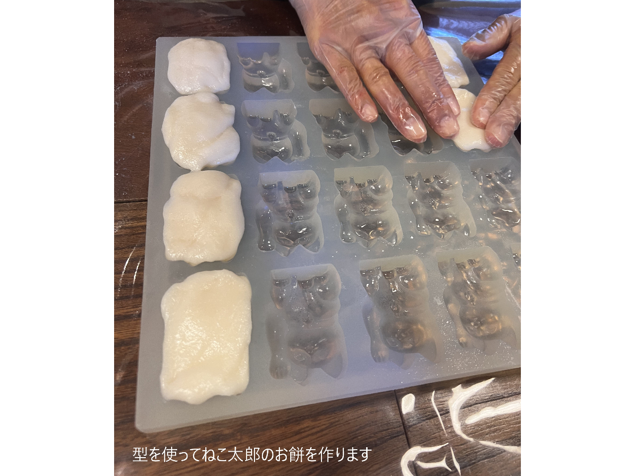 ・ねこたろう餅…ねこの型にお餅をはめ込み、猫の形にします。筆で色をつけてオリジナルのねこ太郎を作ろう!