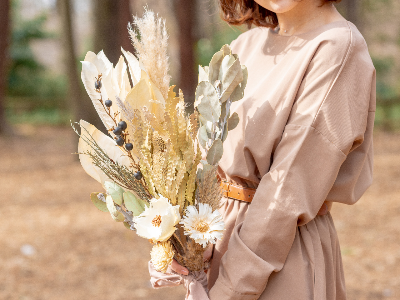 ドライフラワーやプリザーブドフラワーを使ったブーケ作りです。お好みの色や花を選んでお作りいただけます。フラワーアレンジメント・ガーデニング