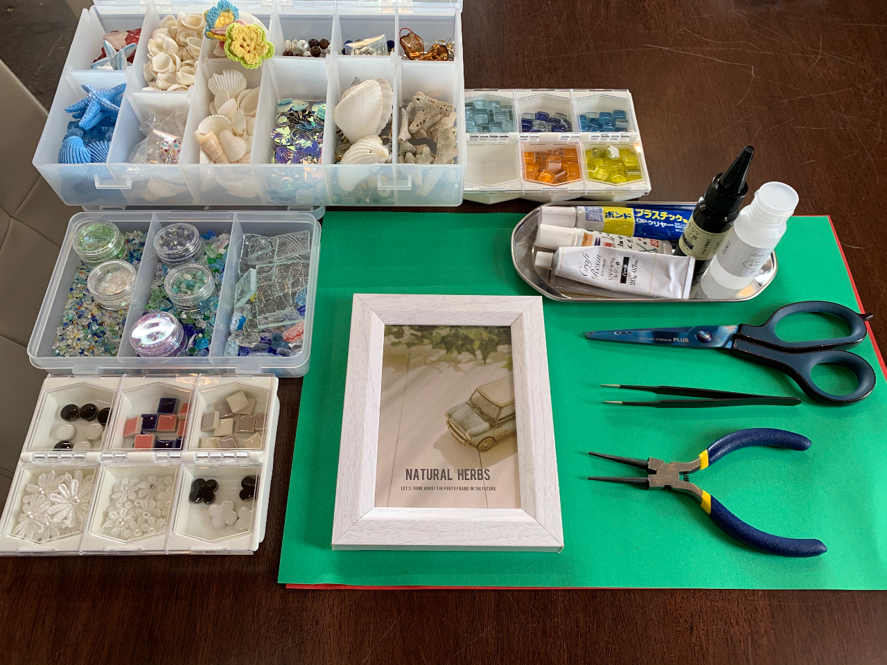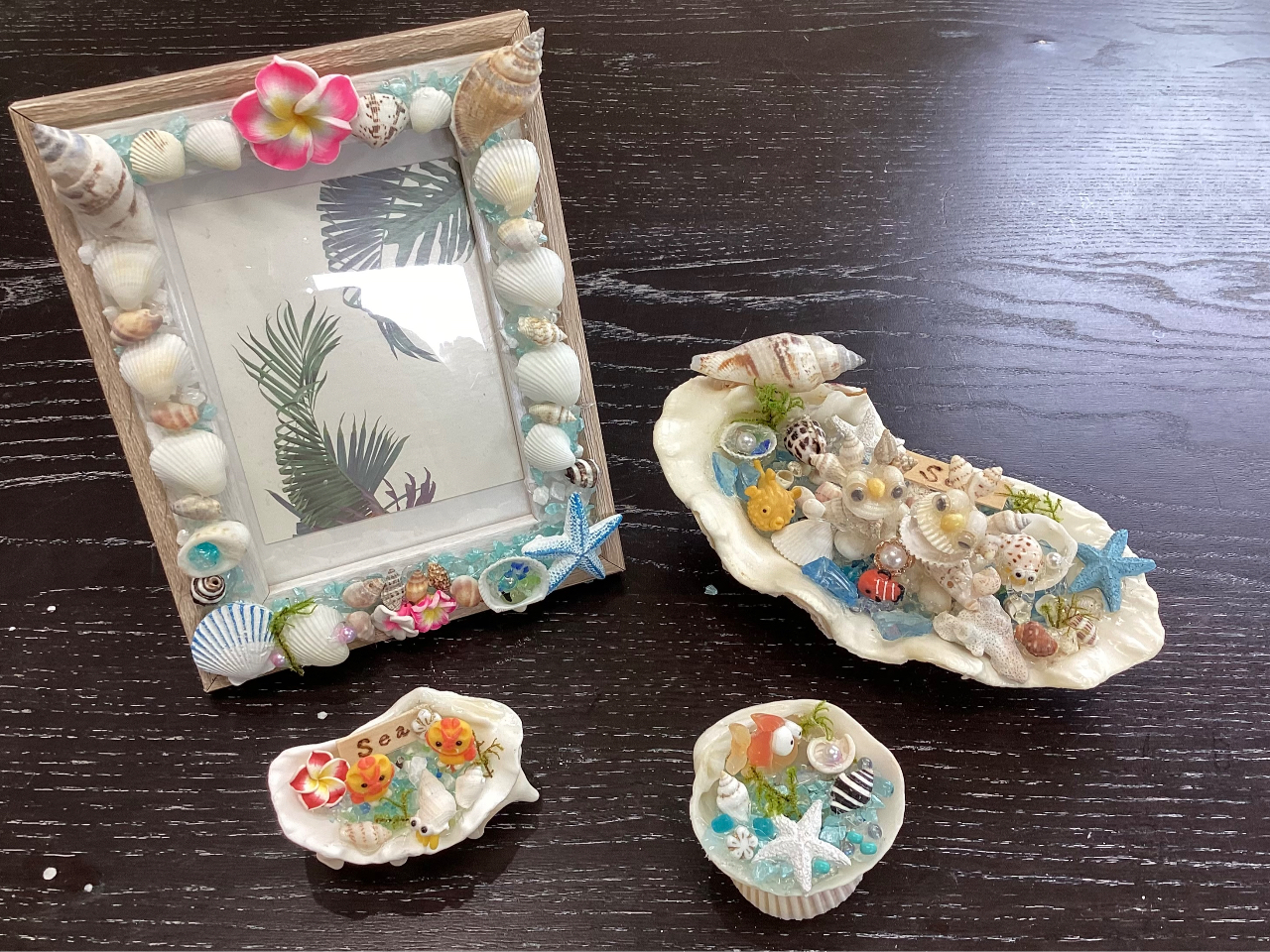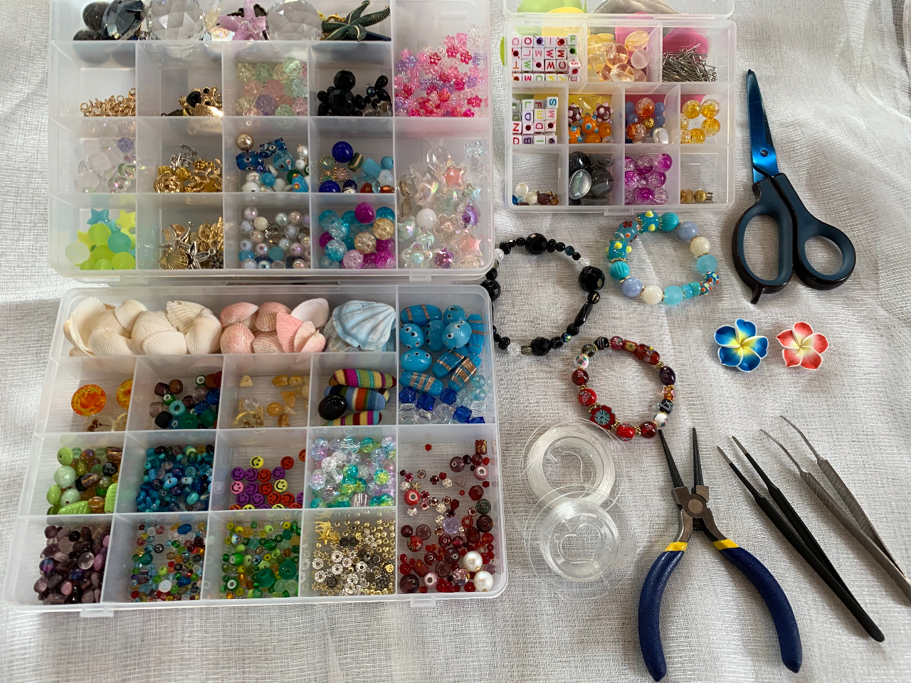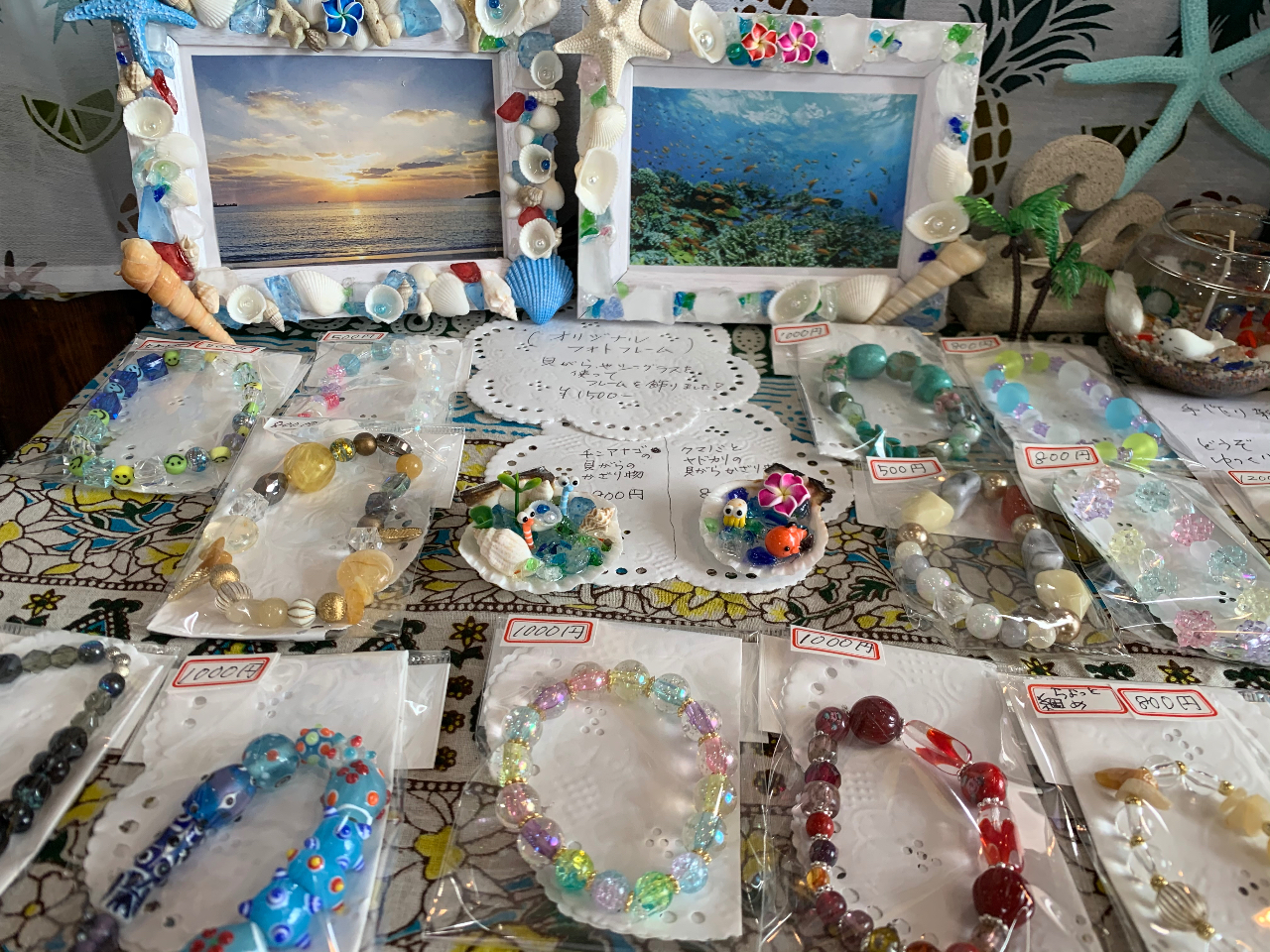 ブレスレット作り、とても楽しく可愛いホタル石の作品が完成。色々な種類の石やビーズが有りましたのでかなり迷いました。