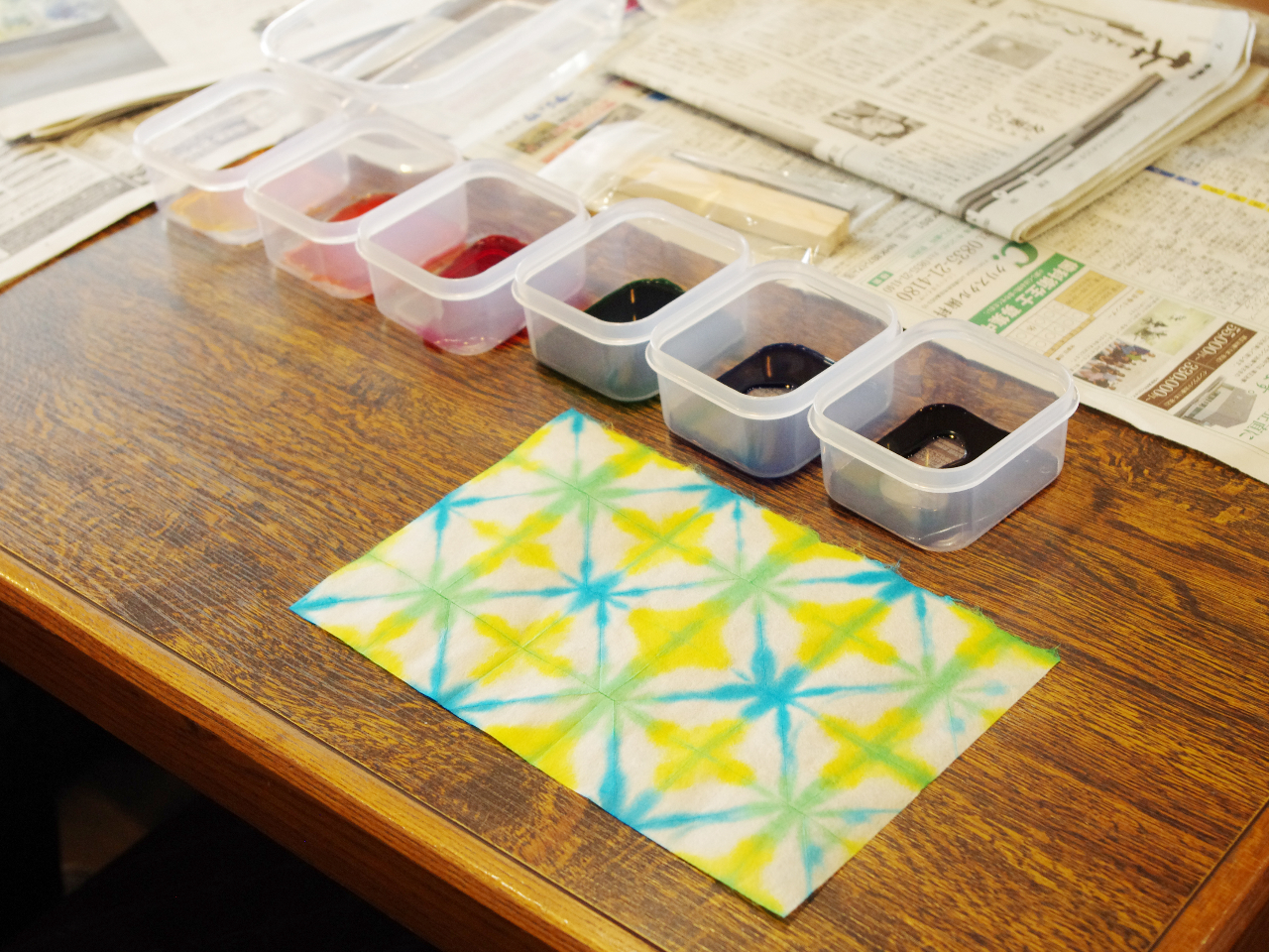 徳地和紙の折染め体験。染めた和紙でオリジナルタペストリーが作れます♪
