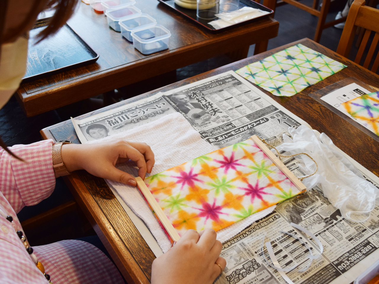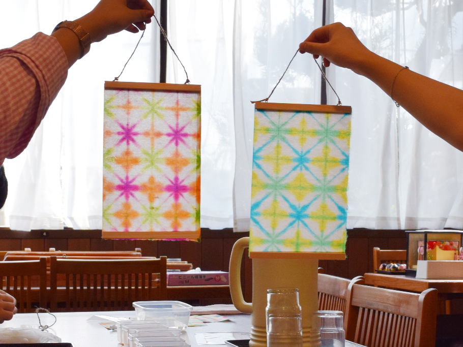 徳地和紙の折染め体験。染めた和紙でオリジナルタペストリーが作れます♪