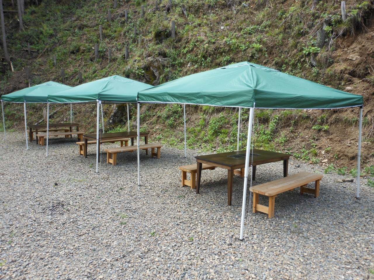 @サイト基本使用料:2500円(夏季は3500円、税込)/1組あたり テント、テーブル、イス、バーベキューコンロ、炭ばさみ、トング、焼き網付