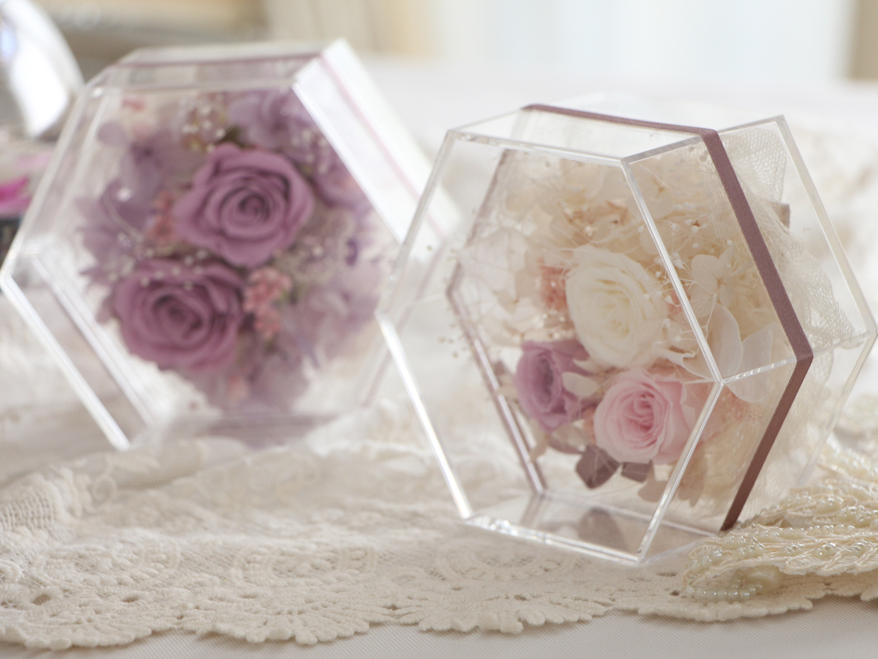 ボックスフラワー クリアケースにフラワーアレンジ |