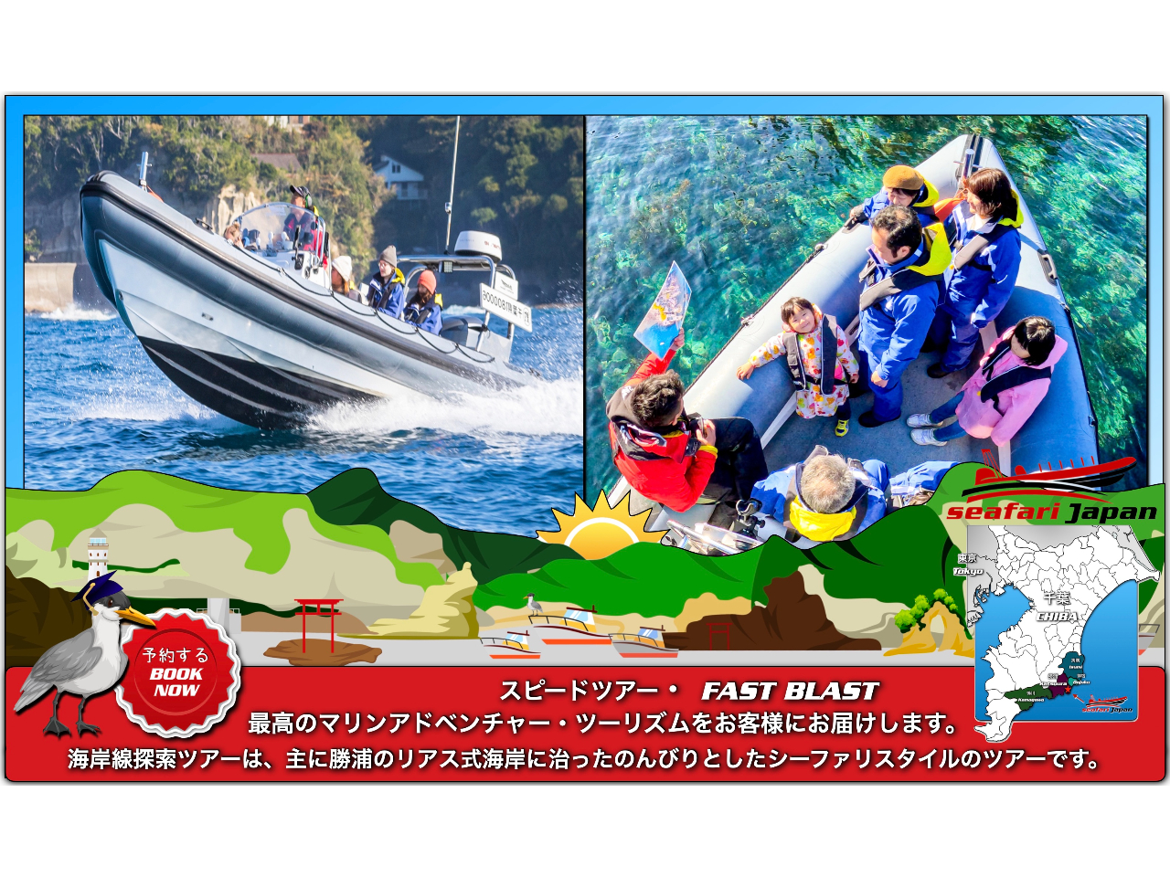 私たちのRIBボートで、千葉県で最も人気のある地域、勝浦湾周辺をクルージングしましょう。こちらのツアーでは、特別なパワースポットである平島の赤い鳥居に向かって、祈玉を投げることができます。勝浦湾周辺で有名なスポット、メガネ岩や黒鼻岬は、息を飲むような景色をお楽しいただけます。さらに、「グルグル体験」コースで「スピード」のスリルも体験できます。Seafari Japanのガイドやキャプテンが歴史をご説明いたします。そして海鳥、トビウオ、そして運が良ければカメに出会える可能性もありますよ