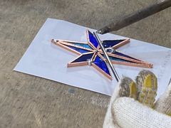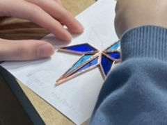 小5の娘が初めてステンドグラス体験しました。先生の説明がとてもわかりやすく丁寧に教えていただきました。作業はカット済のガラスに銅のテープを巻く、ハンダ付け、仕上げという工程です。まず銅のテープを貼る作業に約1時間かかると聞いて驚きましたが最初は慣れなかったようですが集中して作業していました。ハンダ付けも学校の図工の時間では出来ないと思うので貴重な体験でした。