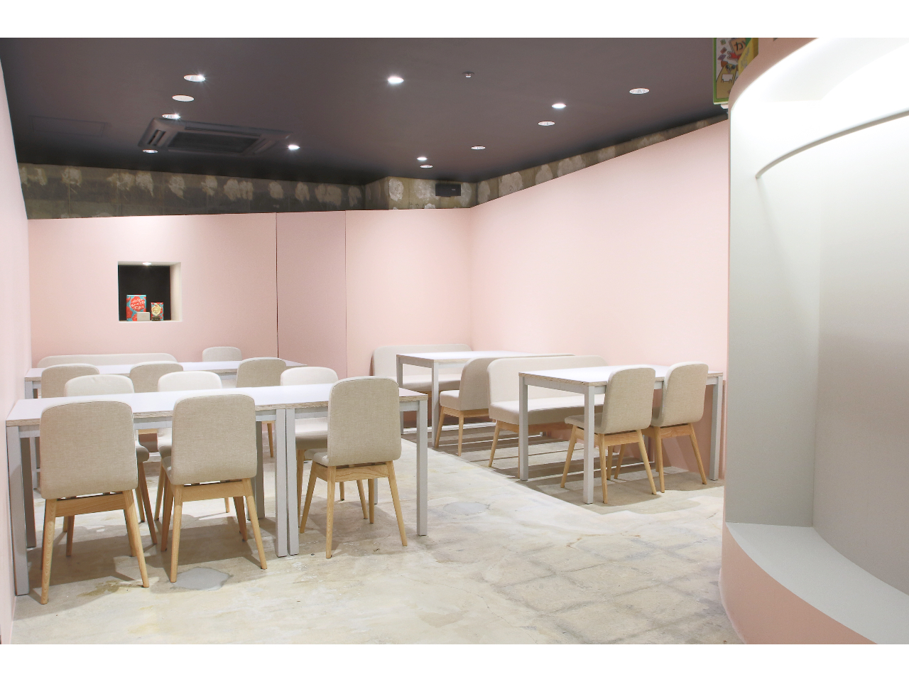 ピンク色の壁の明るい店内には、くつろげるソファ席もご用意。ひとまず様子を見てみたい方には、