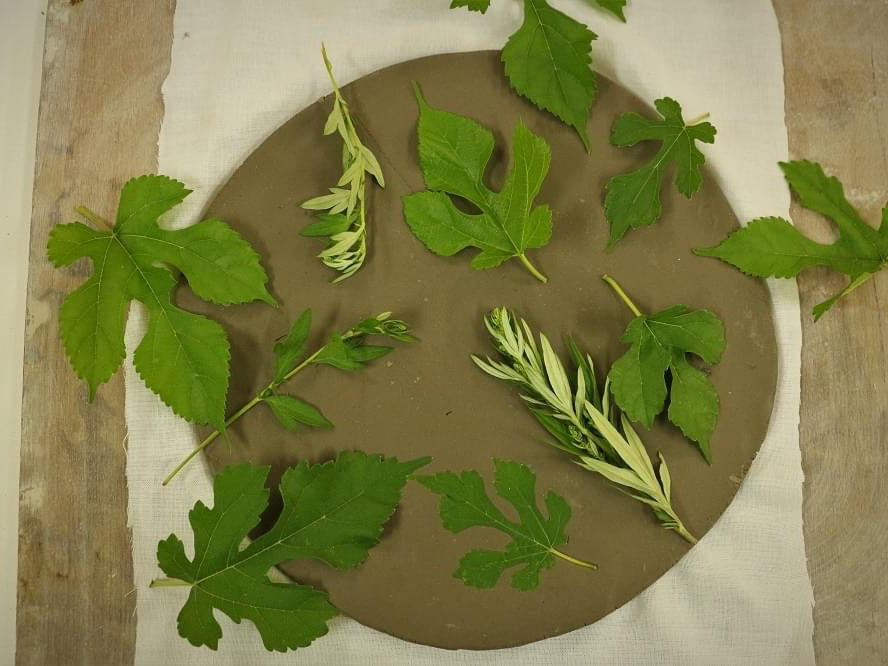 好きな植物をお皿に押しつけて模様にし、形を作っていただきます。