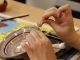 お椀やカップなどに塗料で絵を描き、粉を蒔いてオリジナルの絵を仕上げます。