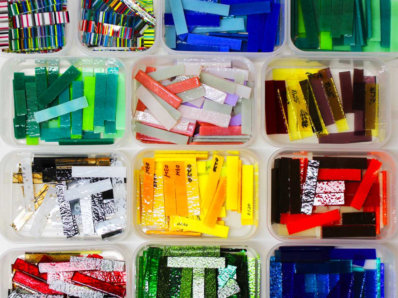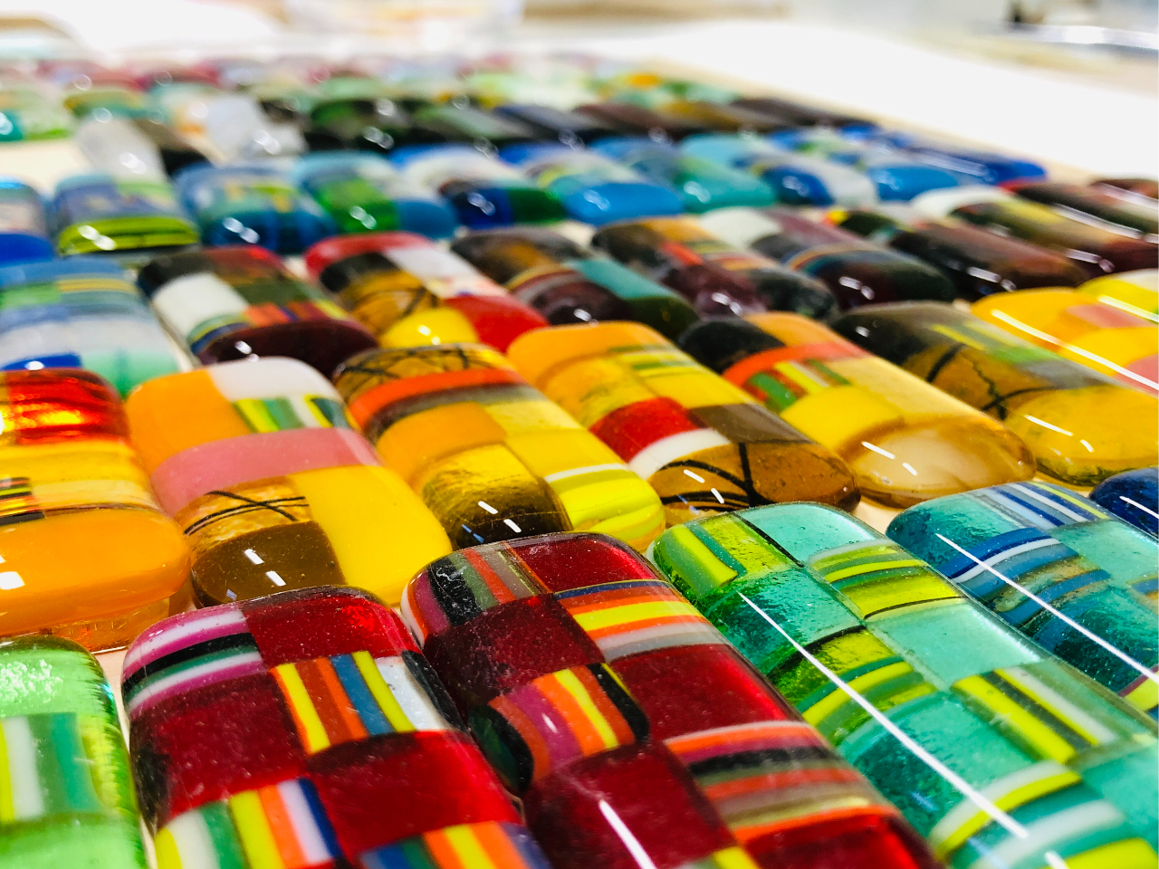 想い描いたデザインになるように板ガラスをカットしてレイアウトし、最後は電気炉で焼き付けて完成させます。ご用意させていただいたカラフルなガラスの中からお好きなものを組み合わせて、オリジナルの箸置きを作りましょう!
