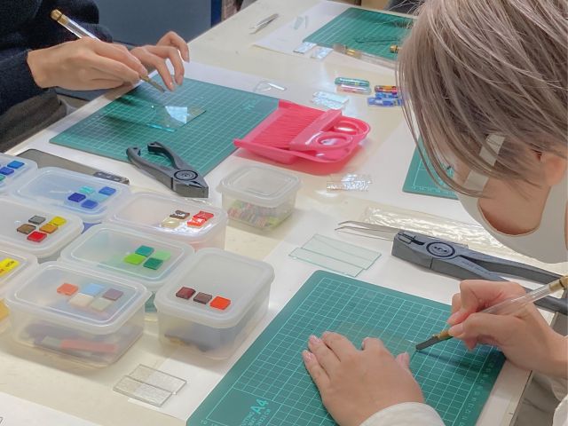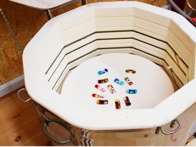 想い描いたデザインになるように板ガラスをカットしてレイアウトし、最後は電気炉で焼き付けて完成させます。ご用意させていただいたカラフルなガラスの中からお好きなものを組み合わせて、オリジナルの箸置きを作りましょう!