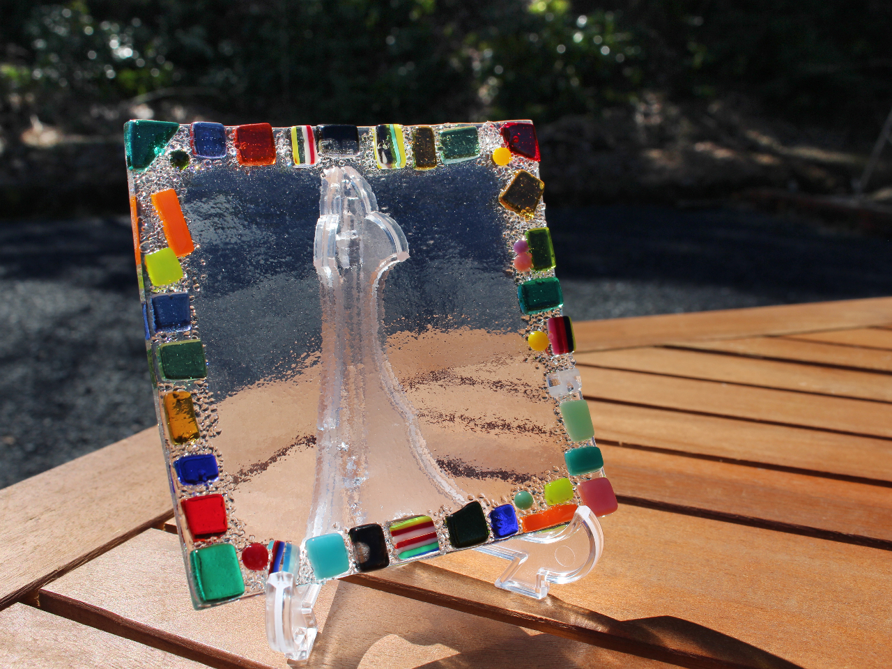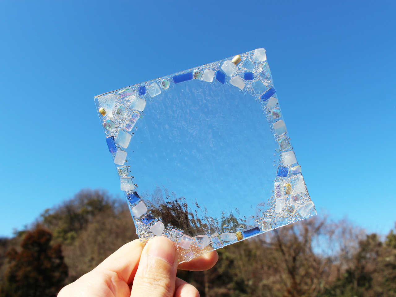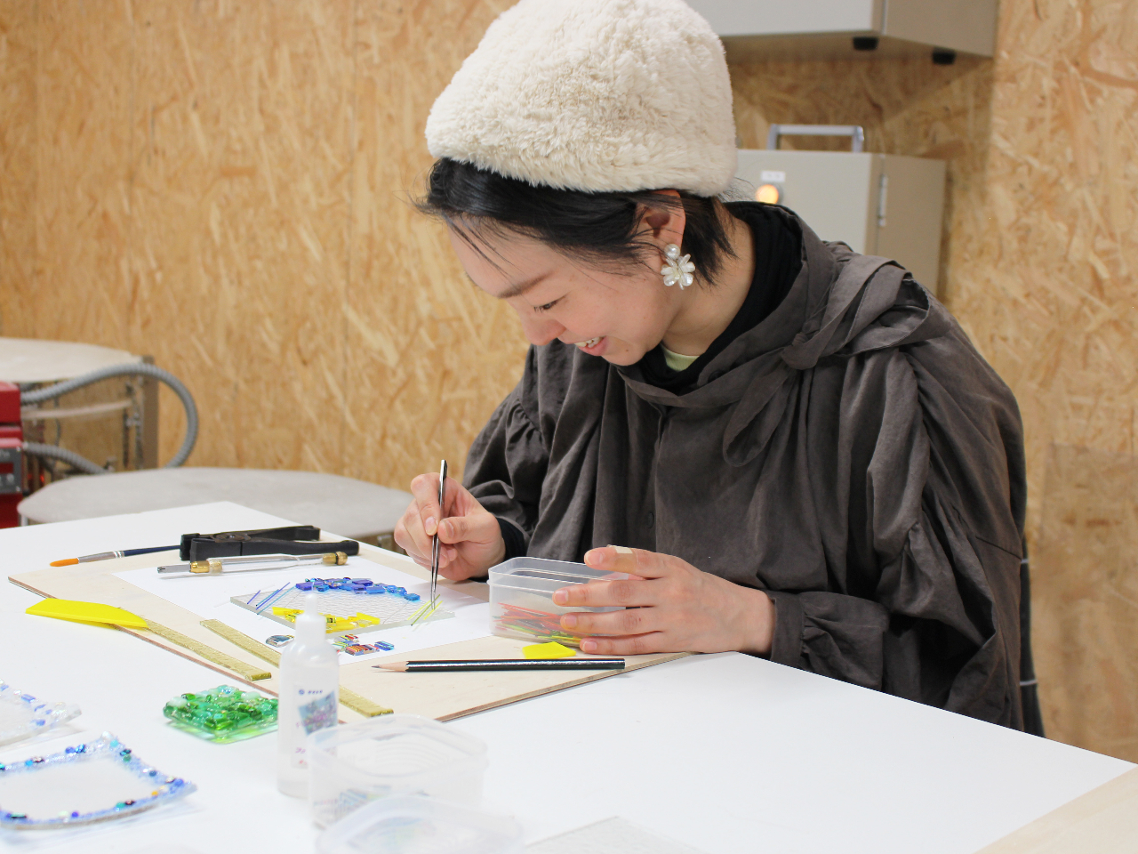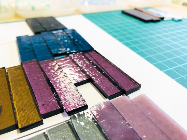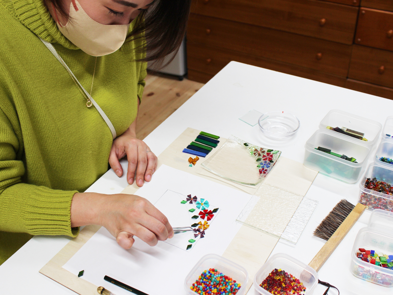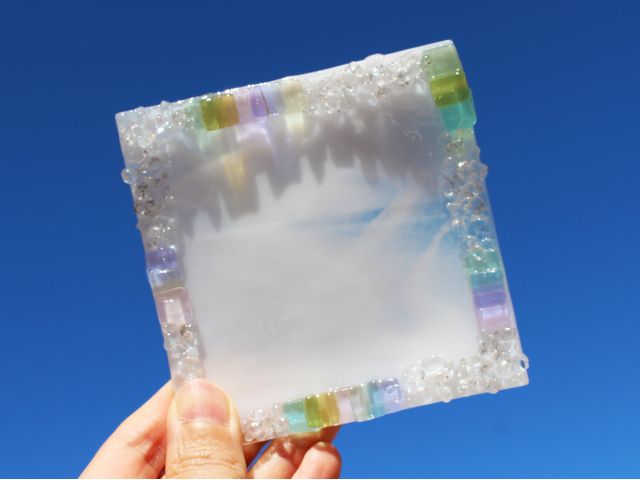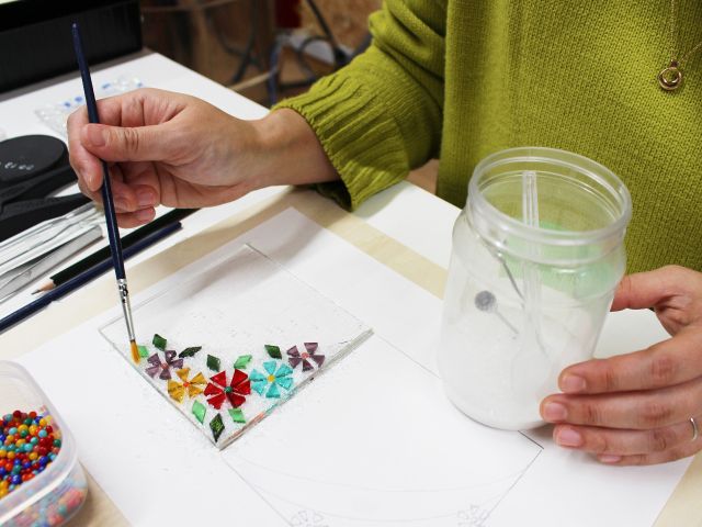 想い描いたデザインになるよう板ガラスをカットし、粒状ガラスやパウダーガラス・棒状ガラスなどを組み合わせ、電気炉で焼き付けて完成させます。