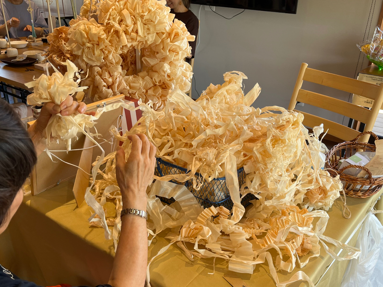 地元松本の建築店さんのカンナ材(かんなくずと呼ばれるもの)を使ってリースを作ります。