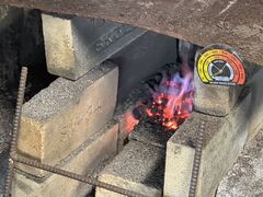 コークスと言う燃料を使って素材を焼きます。 写真では見えませんが、この左に手動の吹子があります。