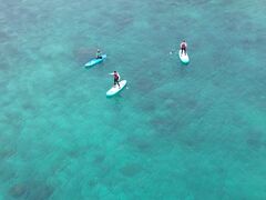 ガイド2名体制でのお出迎えですので、ドローン撮影中でも一人が側に、シュノーケル中は前後にガイドがいて安全に楽しんで頂けます。サップ・SUP(スタンドアップパドル)