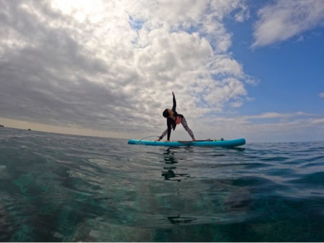 サーフボードみたいな大きなボードに乗って、海の上でヨガをするアクティビティ