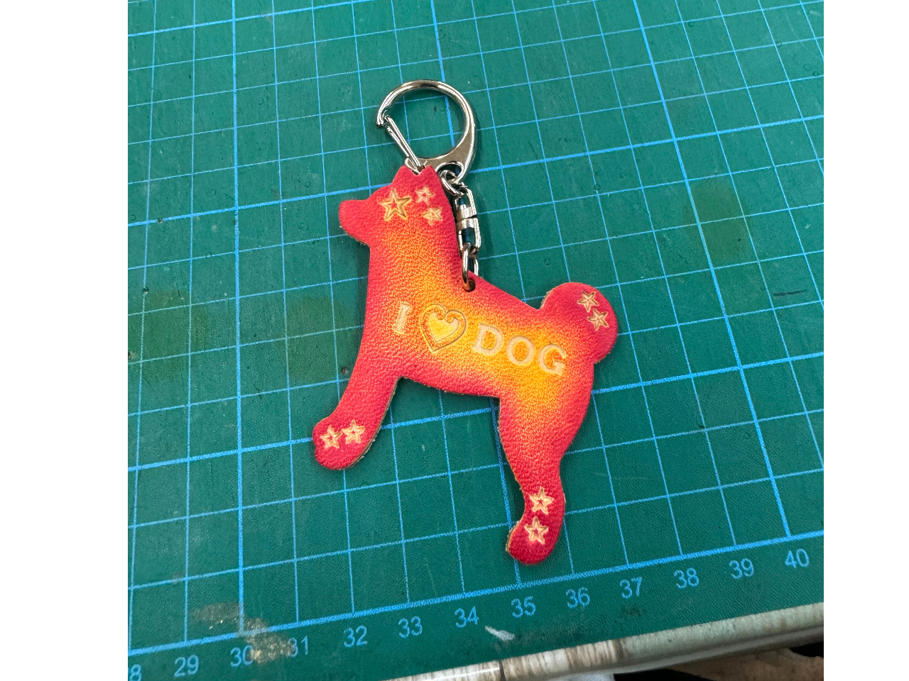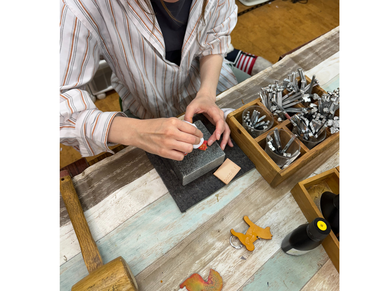 可愛い動物やハートなどを型抜きした革に英字やいろいろな柄の刻印、そして染色をすることができます。