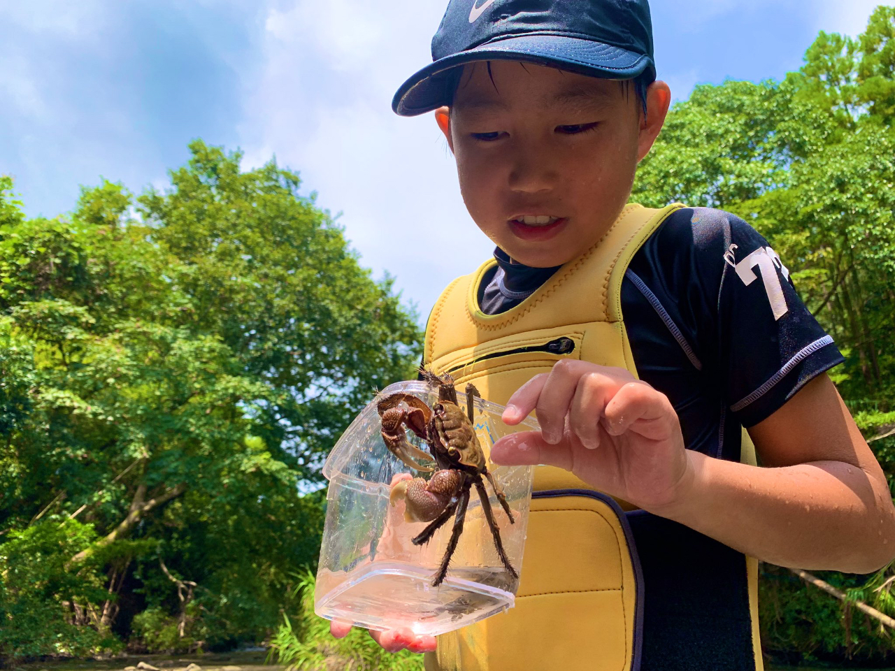カニやタニシなど川に住む生き物を探したり平らな石を見つけて水切りなど