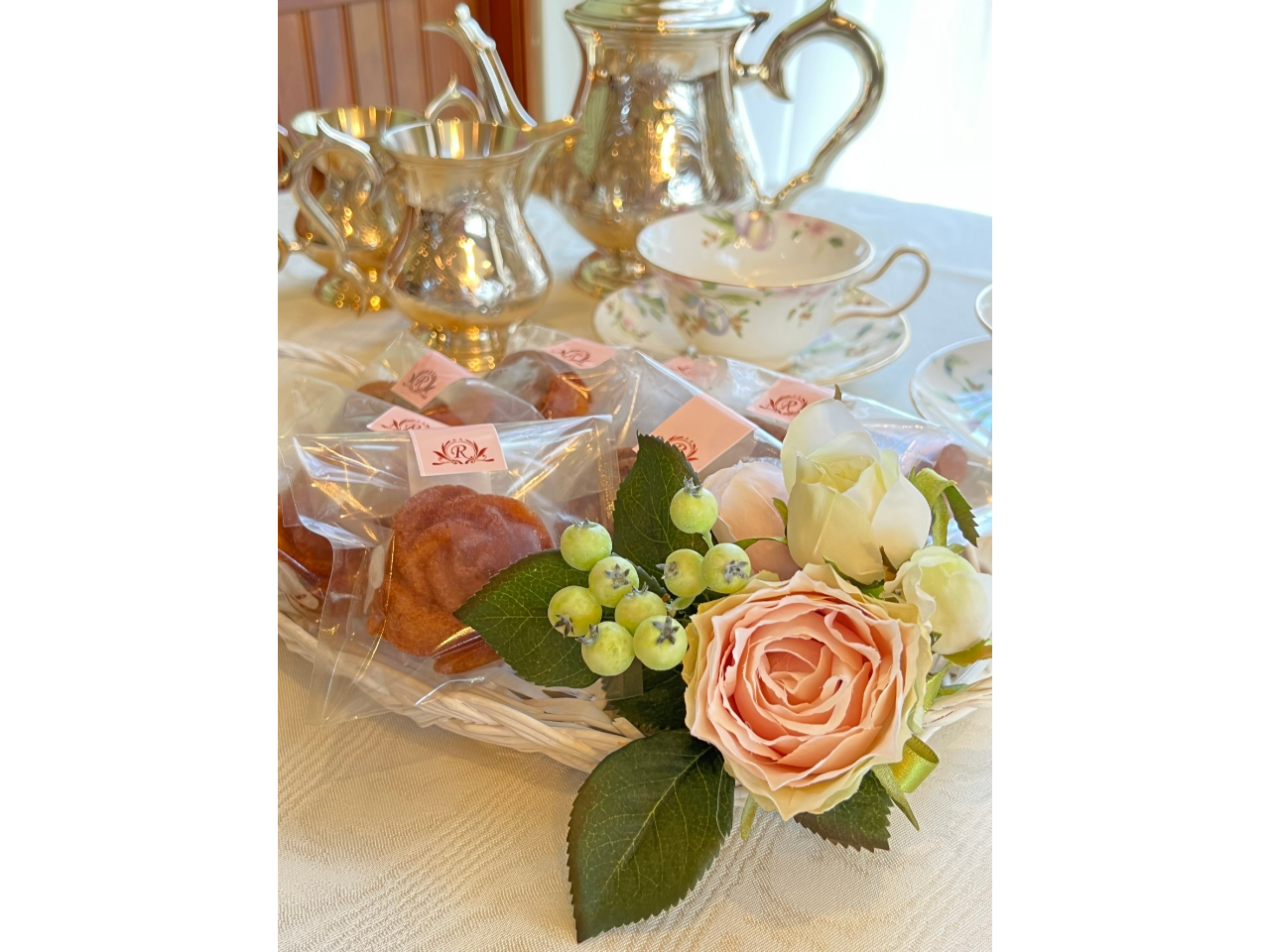 バラのフィナンシェとアーティフィシャルフラワーの小さなブーケを作りおしゃれなギフトを作成します。焼き菓子、ギフト作成どちらも体験できるコースです。