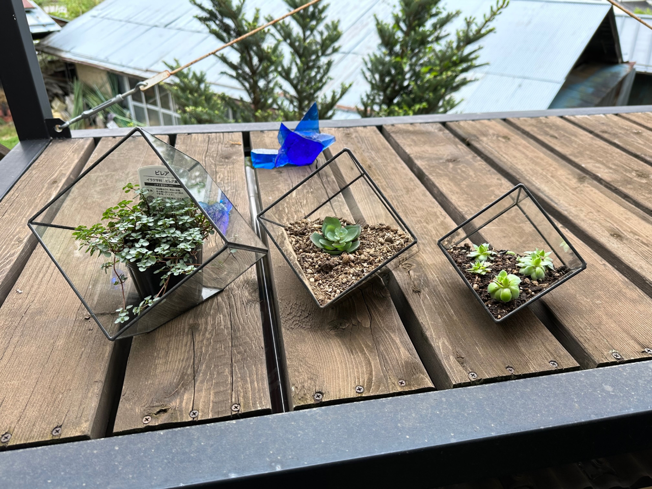 多肉植物やフェイクグリーンが引き立つようシンプルな透明ガラスを使います!