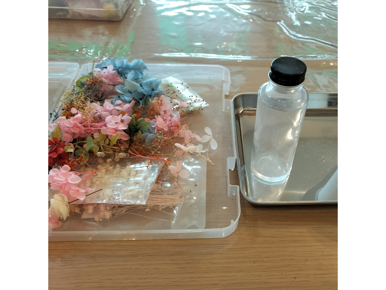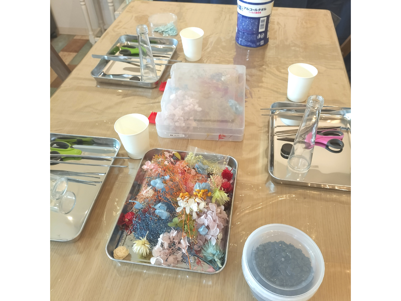 各席の前にはドライフラワーなどがならび、ピンセット、ハサミなど置いてあります。ハラミやピンセットの使用方法は事前にご説明します。