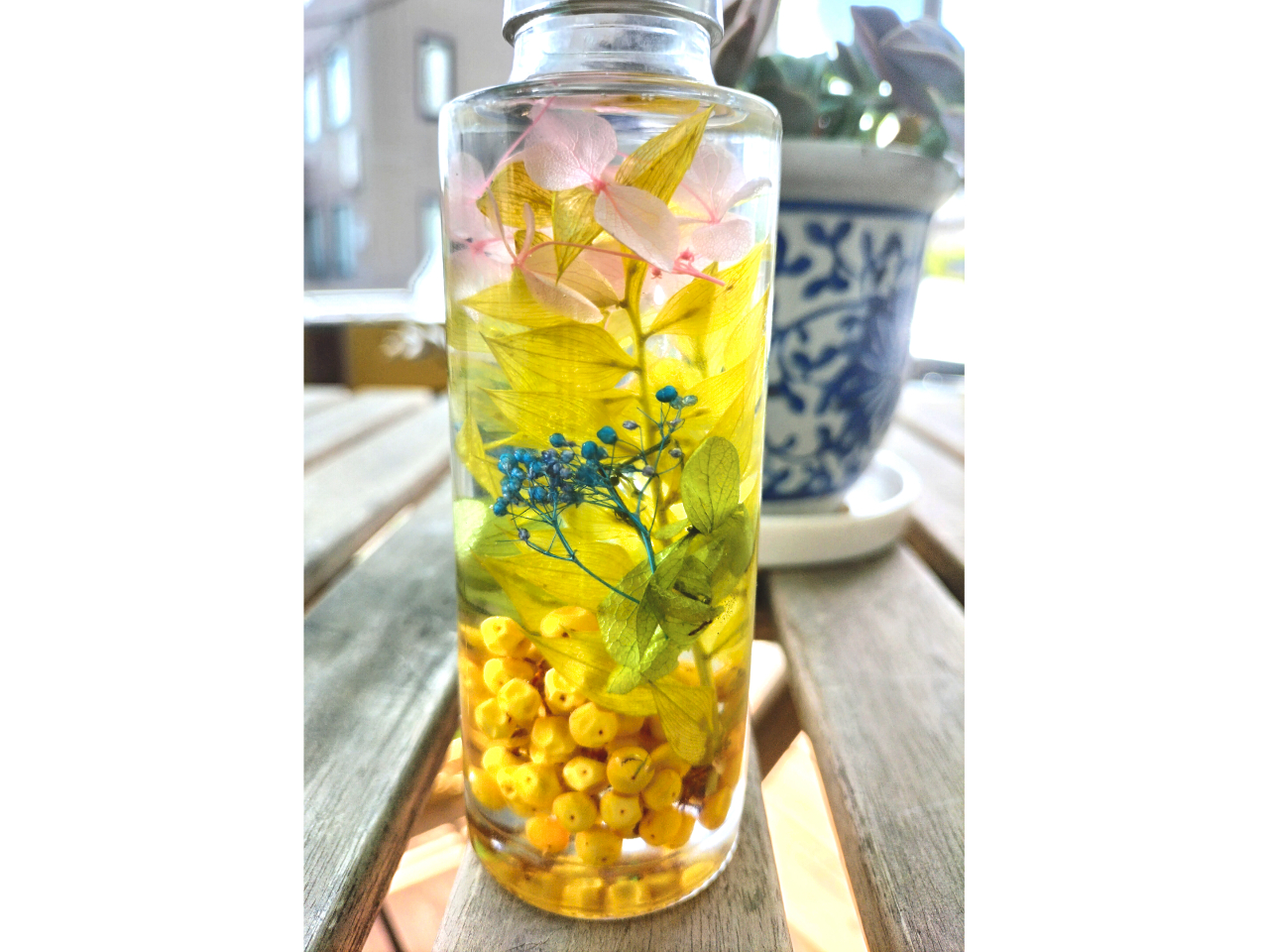 お花の色の組み合わせが自由です。この作品は多種類の花をいれていますが色のバランスを考えながら制作するといいですよ。瓶の底に蓄光を敷き詰めると夜も楽しい。