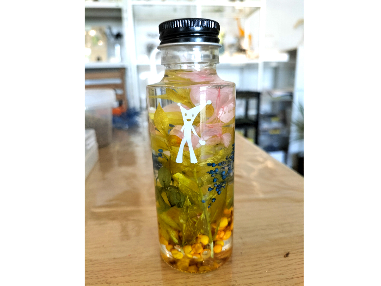 花と妖精がテーマのハーバリウムです。あなたの好みのお花を入れて一味違う、花の世界を鑑賞しませんか?今回は瓶の底に蓄光を敷き詰めてちょっと幻想的な作品になります。