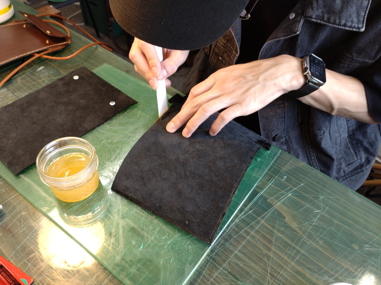 4.革の切り口(コバ)を磨き液を塗って磨いて頂きます。