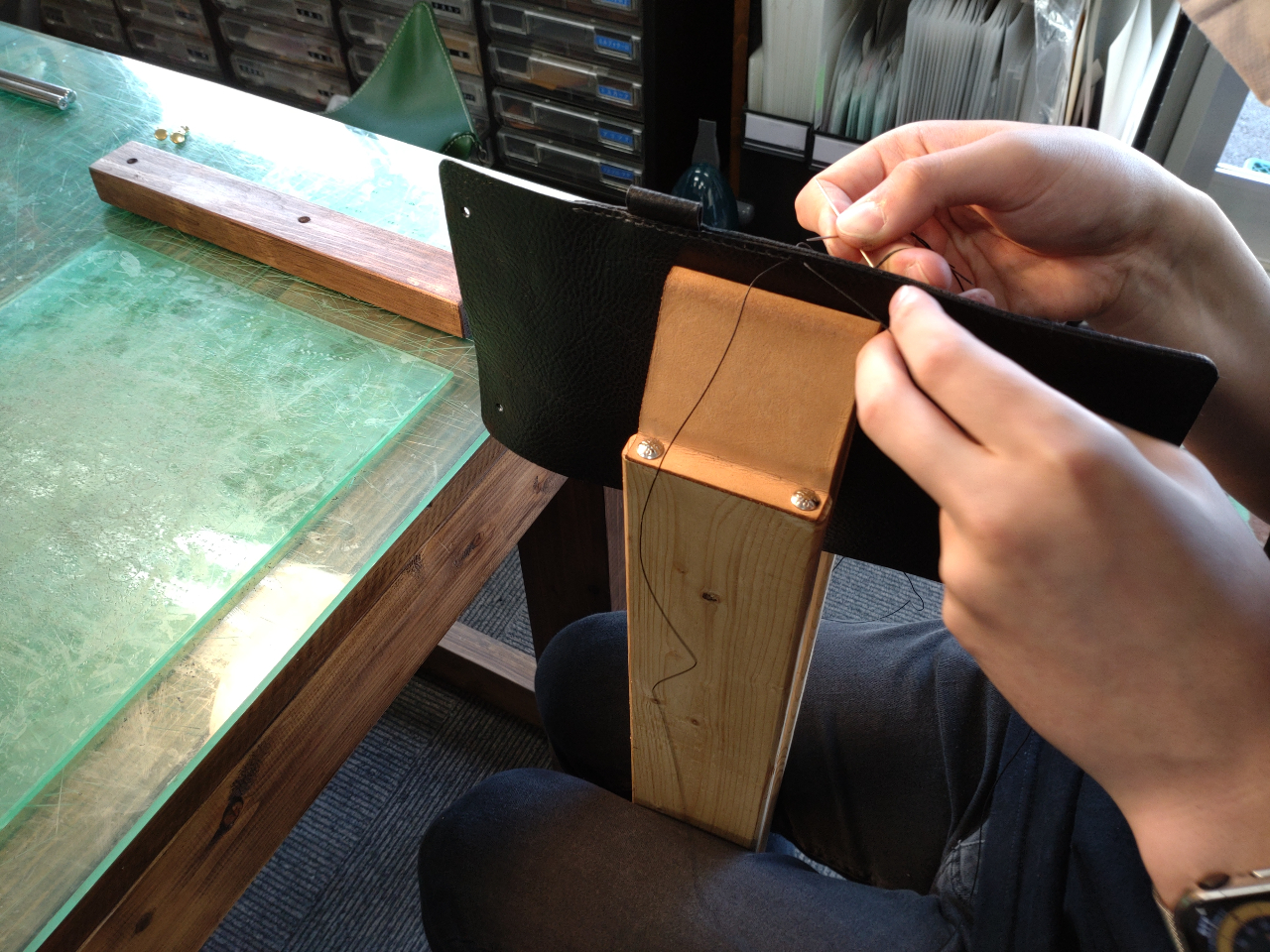 7.レーシングポニー(手縫いするための道具)を使って2本の針で手縫いします。