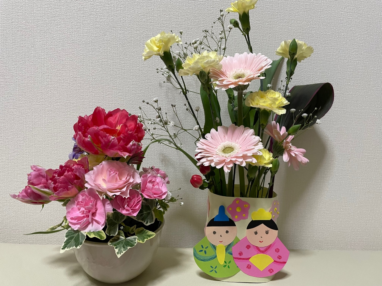 お子様に折り紙やリボンなどを使って花器に装飾をしてもい、自分の花器にお花を生けて飾っていただきます。(親子レッスンも可)