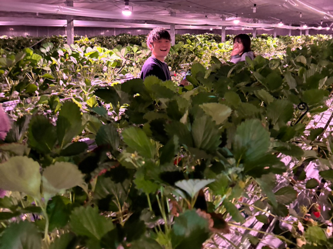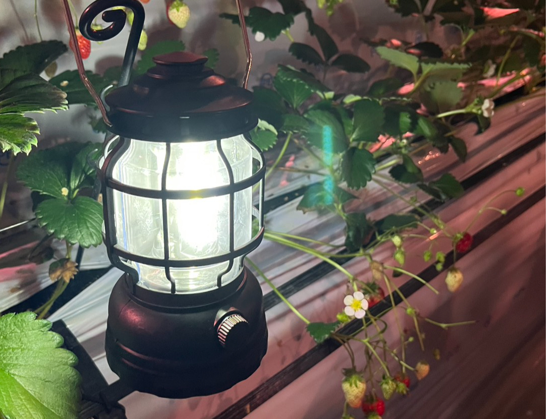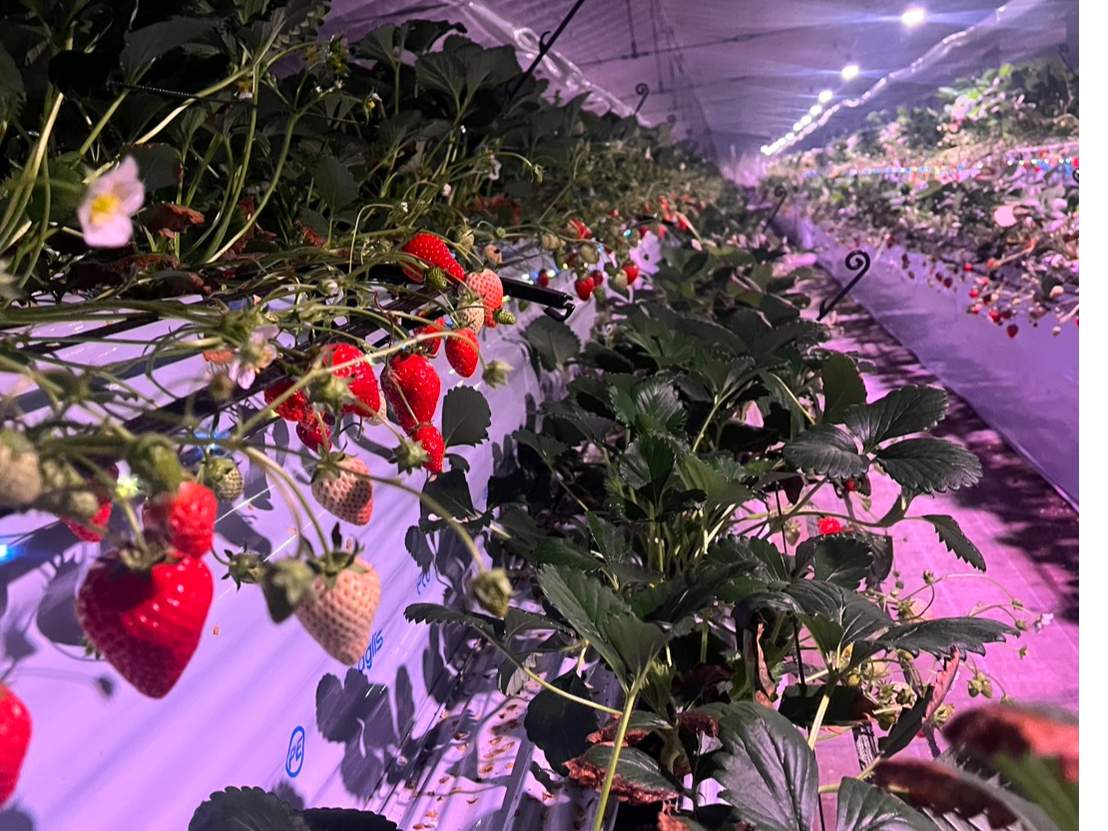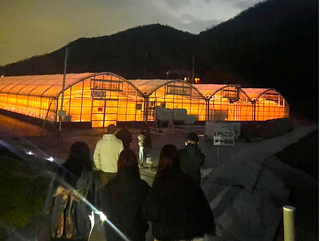 ライトに照らされた幻想的ないちごハウスで、いちご狩りをお楽しみください。
