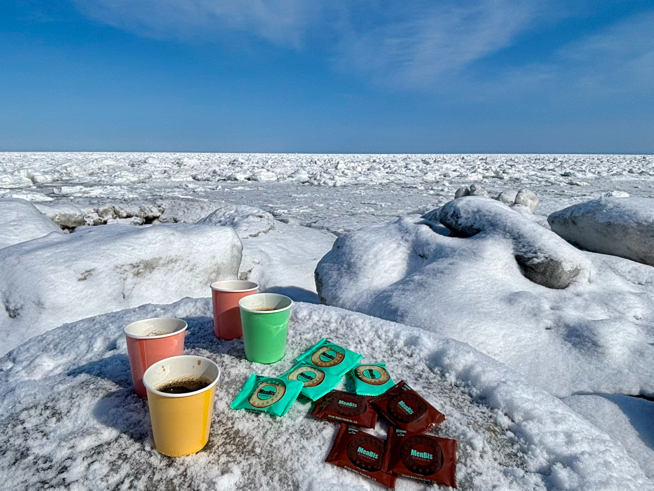 ライドの途中には、流氷を目の前に、ガイド自家焙煎のコーヒーと北見ハッカのお菓子を楽しむ「流氷カフェ」タイムも。