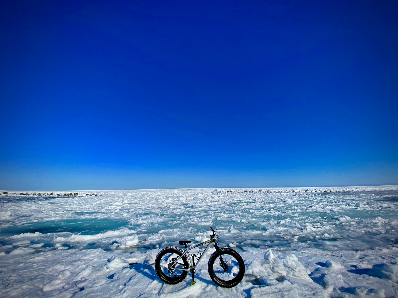 前半は、オホーツク海の流氷を間近に望みながら、白い浜辺をファットバイクでゆっくりライド。