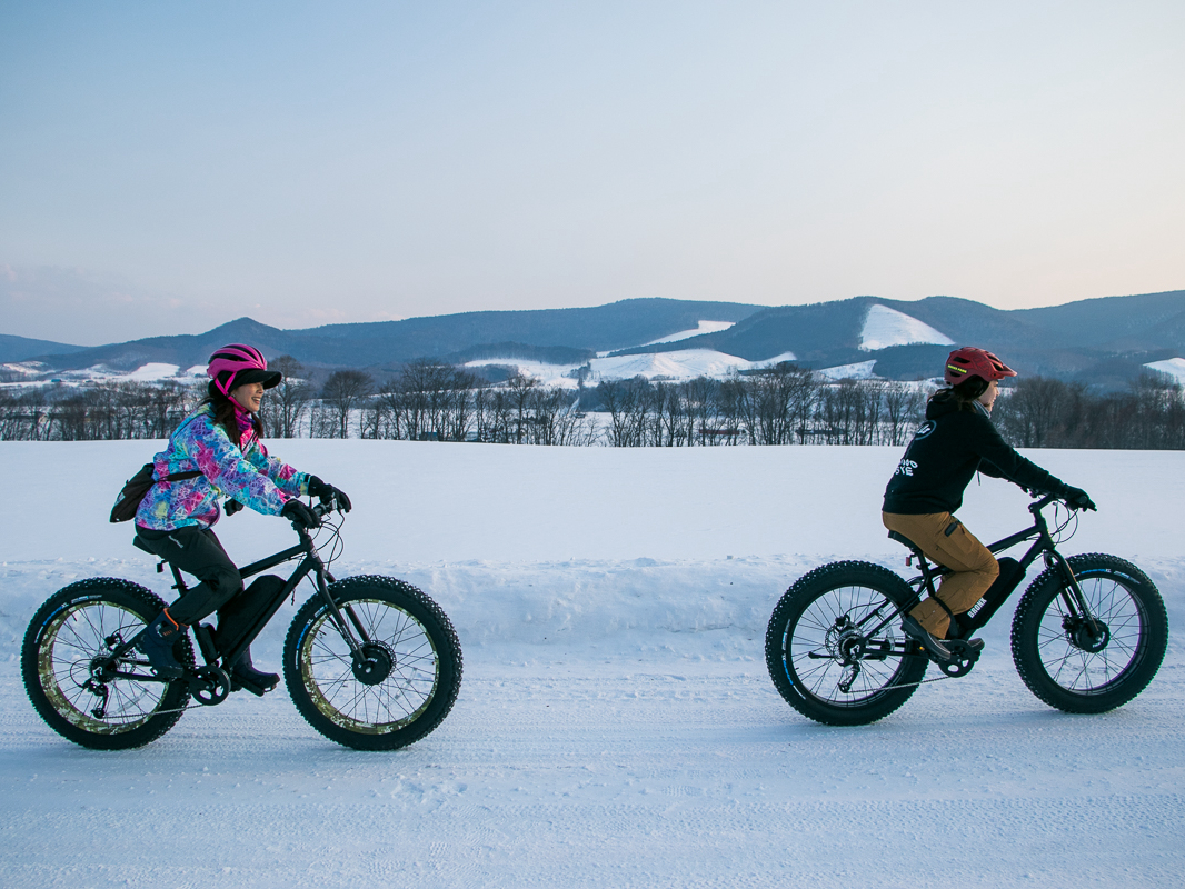 冬の北海道らしい田園風景のなかを進みながら、雪道サイクリングならではの浮遊感と静けさを味わえます。