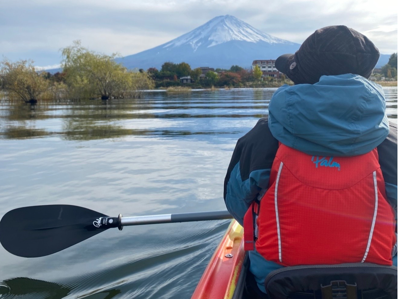 ▼河口湖から見える富士山を堪能しながらのカヤックツアー