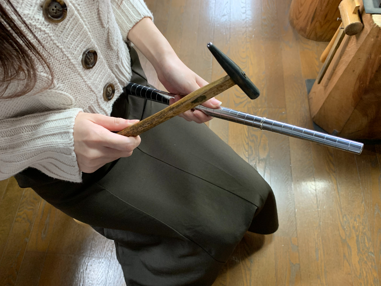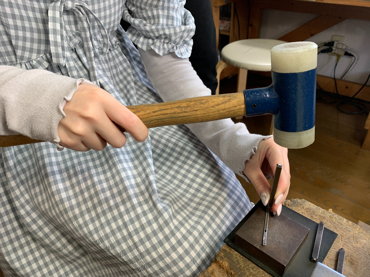 芯金という道具とハンマーを使ってリングに柄入れ。