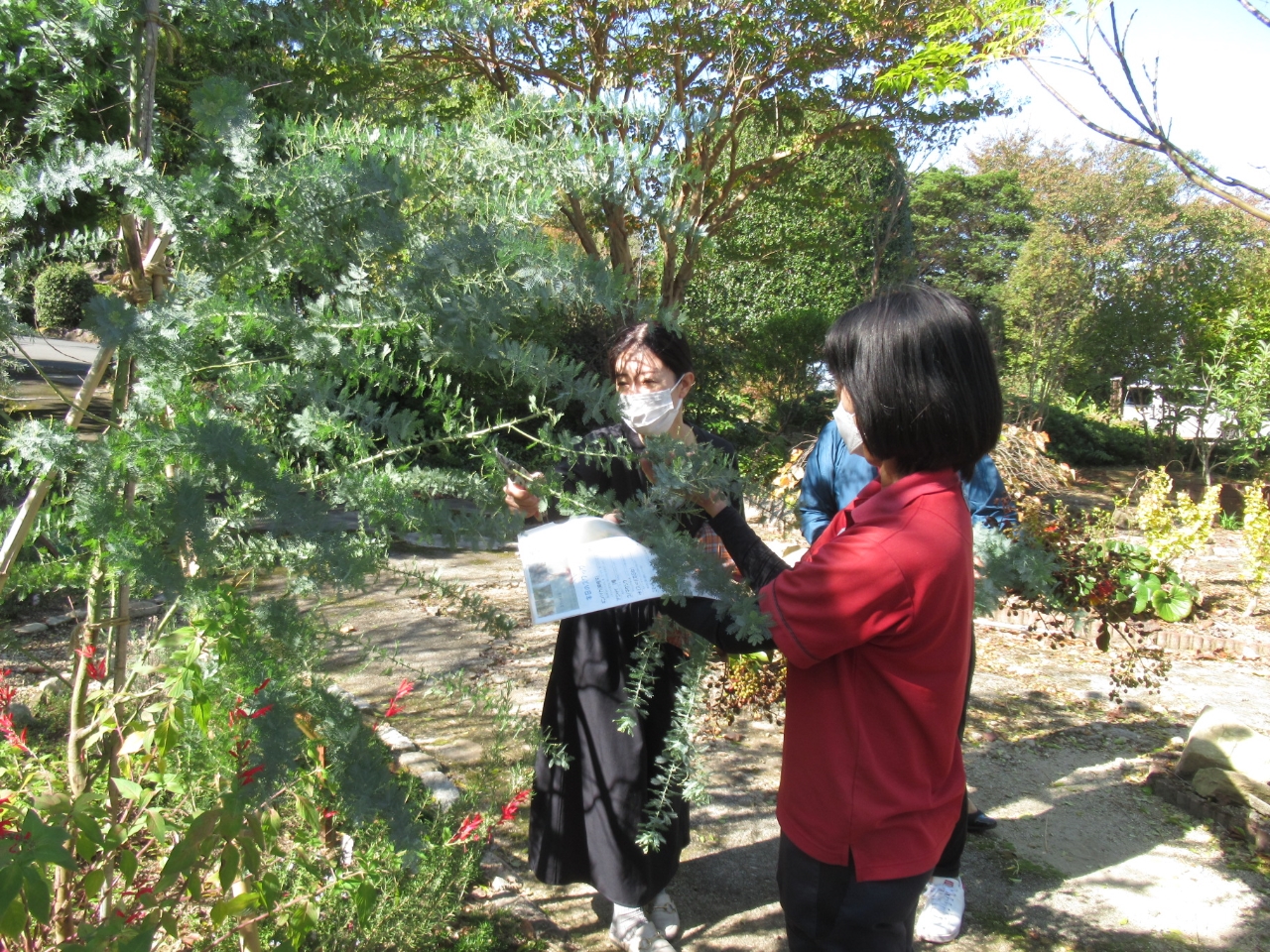 苑内の樹木や花木をスタッフが説明を行いながら、実際にスワッグに使用する枝を植木屋さんが使う剪定鋏でカットします