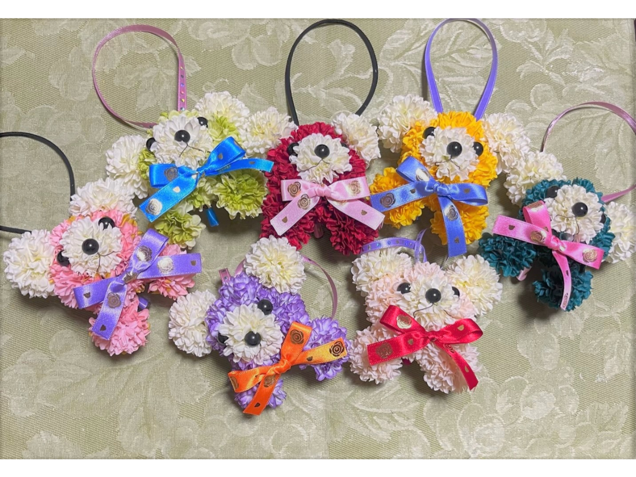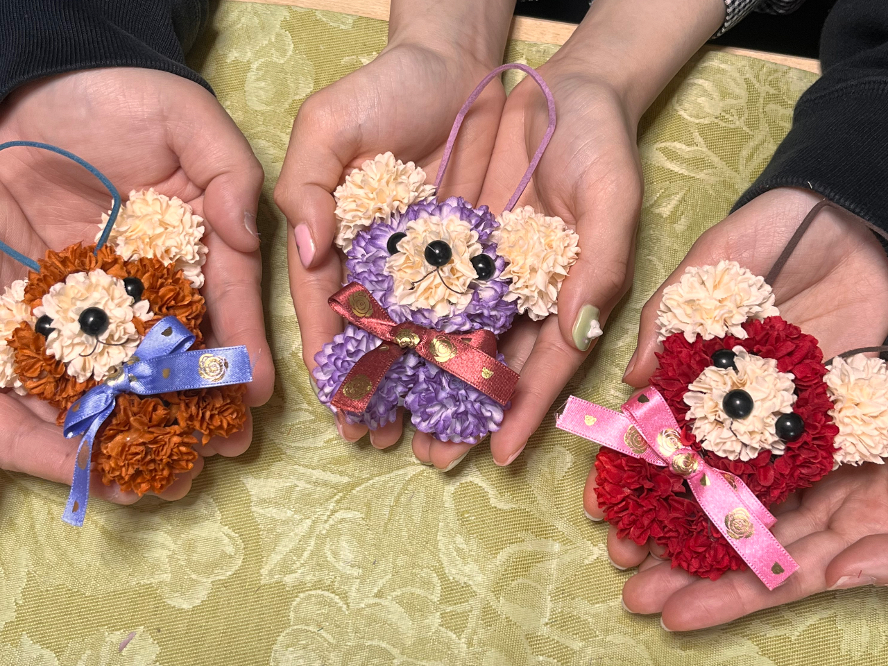 ●お好きなお色とリボンを使って、造花のお花で花テディベアのチャームが作れます!