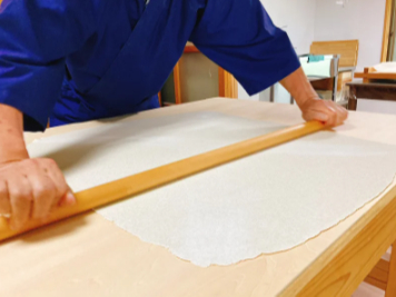 めん棒でうすく伸ばす工程です。 空気に長くさらしていると風味が落ちるため手早さが大切です。