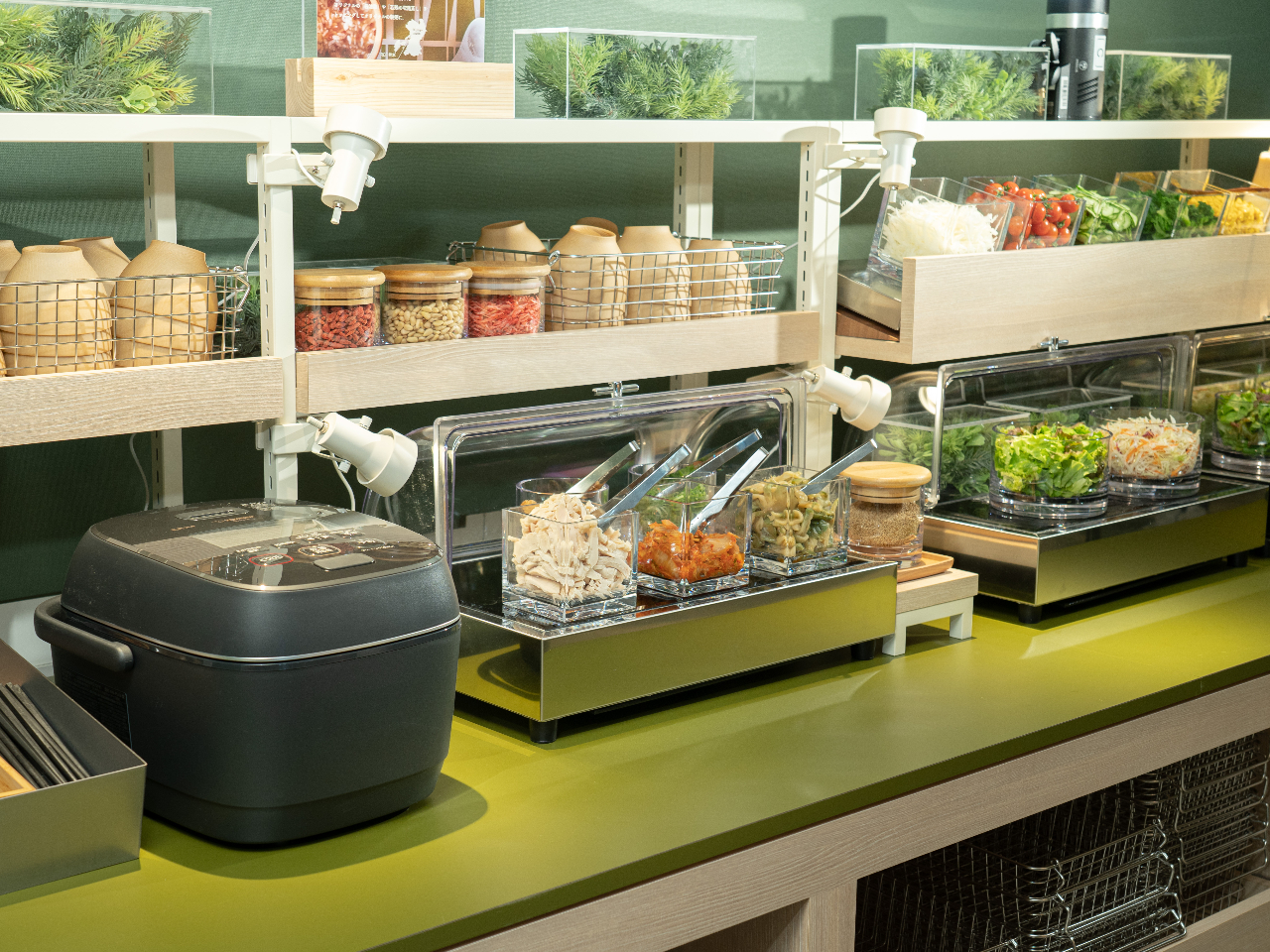 サラダ・おかゆコーナー★新鮮サラダをはじめおなかにやさしいおかゆもご用意。搾菜など多種多様なトッピングをお楽しみください。