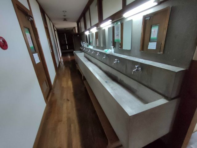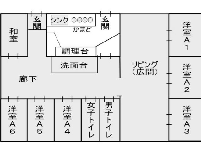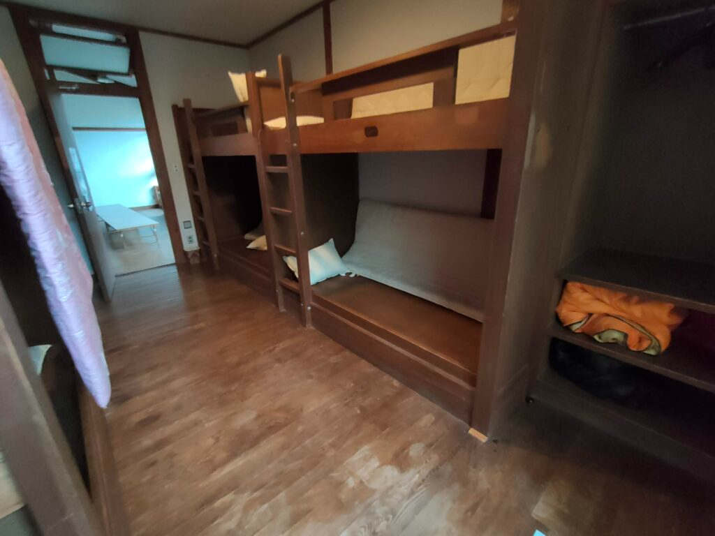 【間取り】8人部屋(2段ベッド×4台)×6室、和室(2名用)、大部屋、台所、洋式トイレ、洗面台