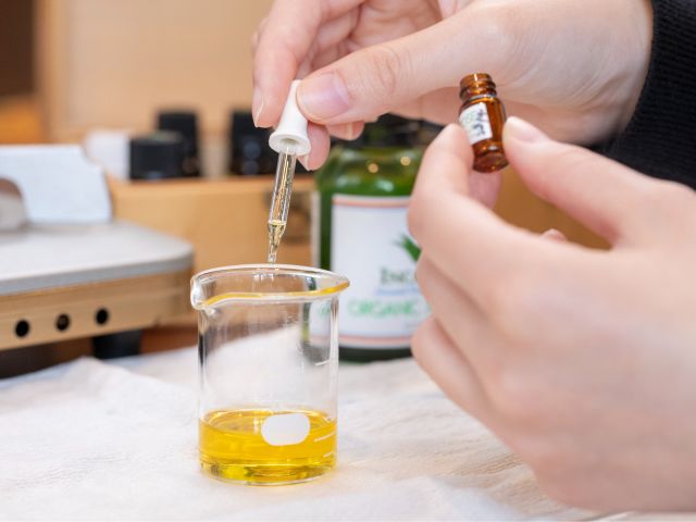 30本ほどの精油の中から、お客さまオリジナルの香りを調香して楽しむことができます。
