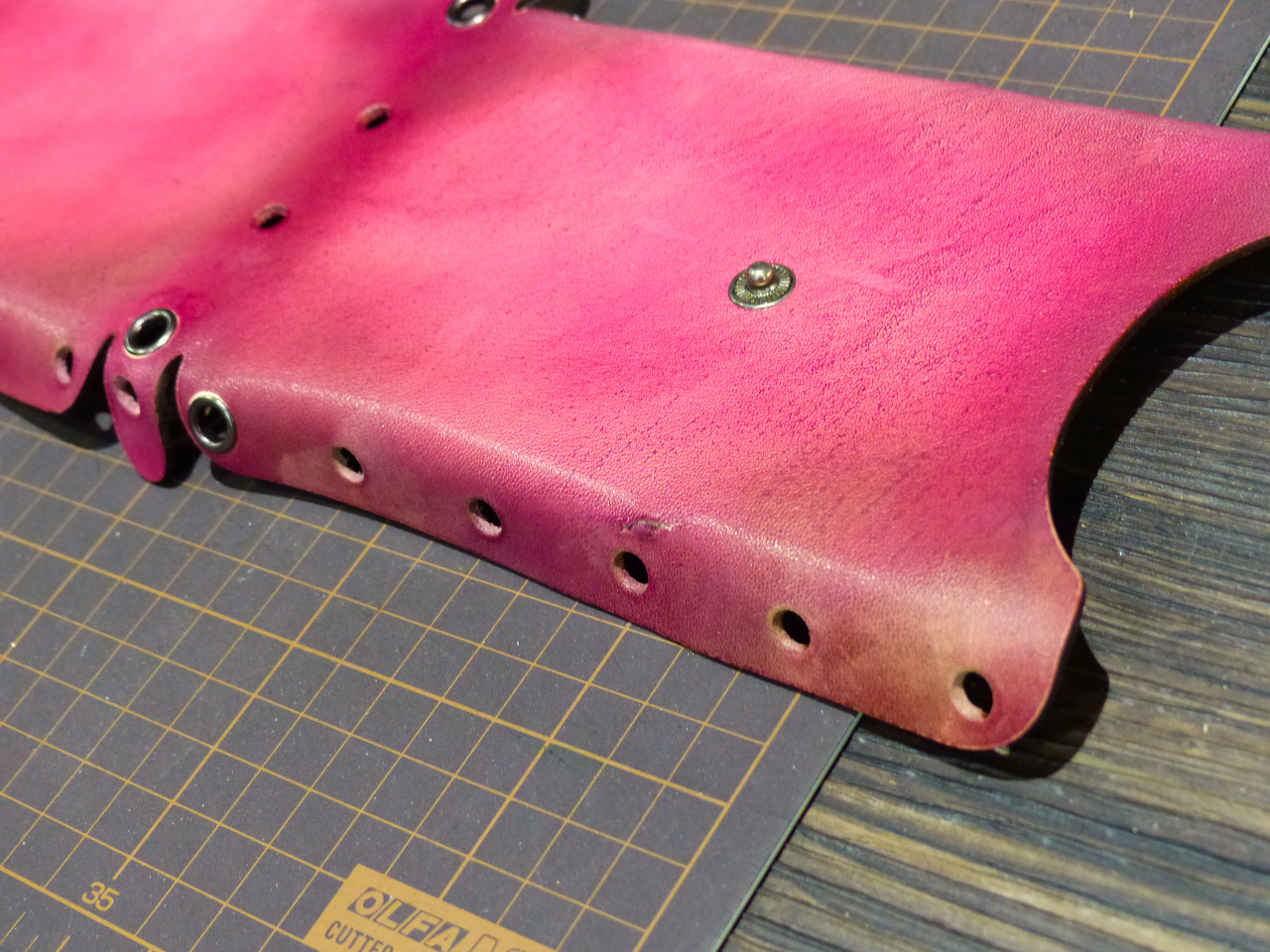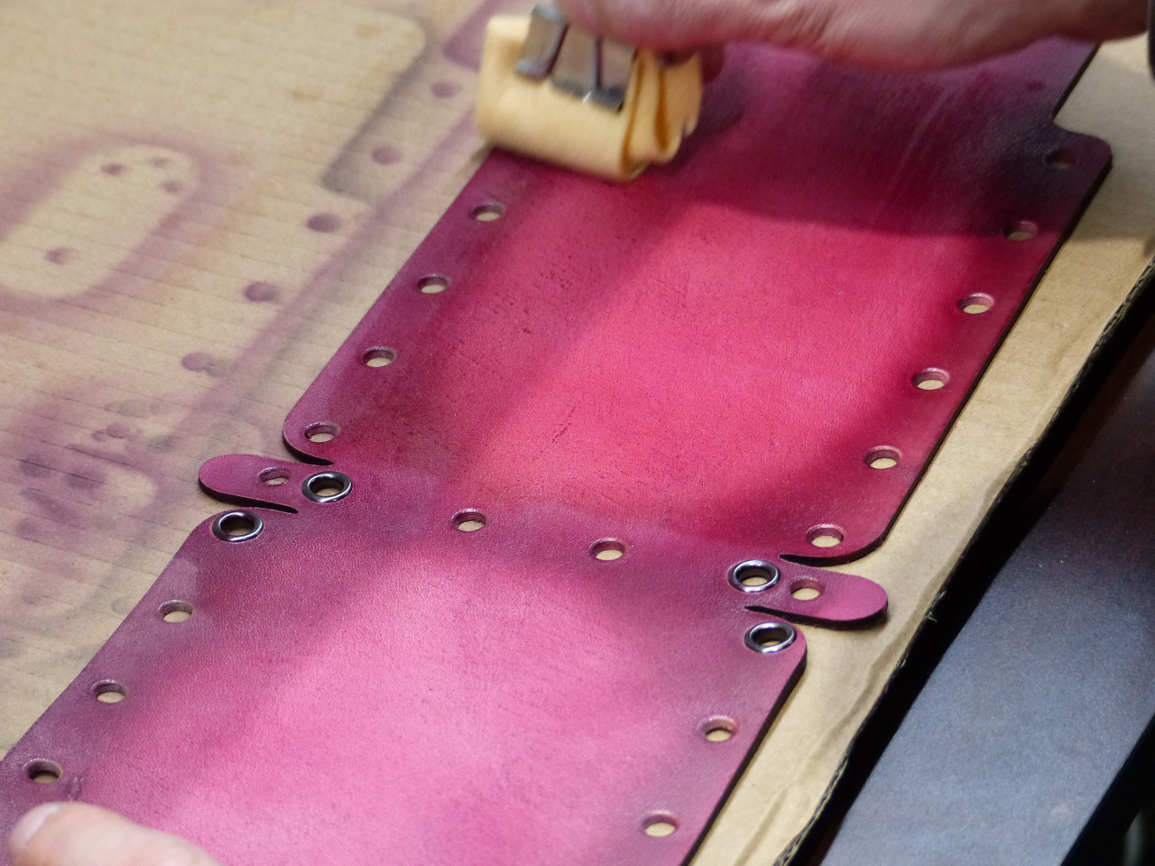 裁断された革をそのまま染色し、ストラップを通すことでどなたでも簡単に組み立てることができます。