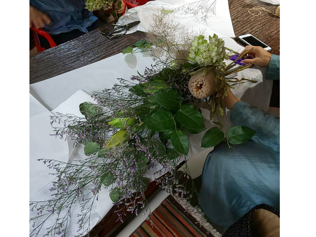 テーブルの上に飾るフラワーアレンジをつくり、レッスンの後は