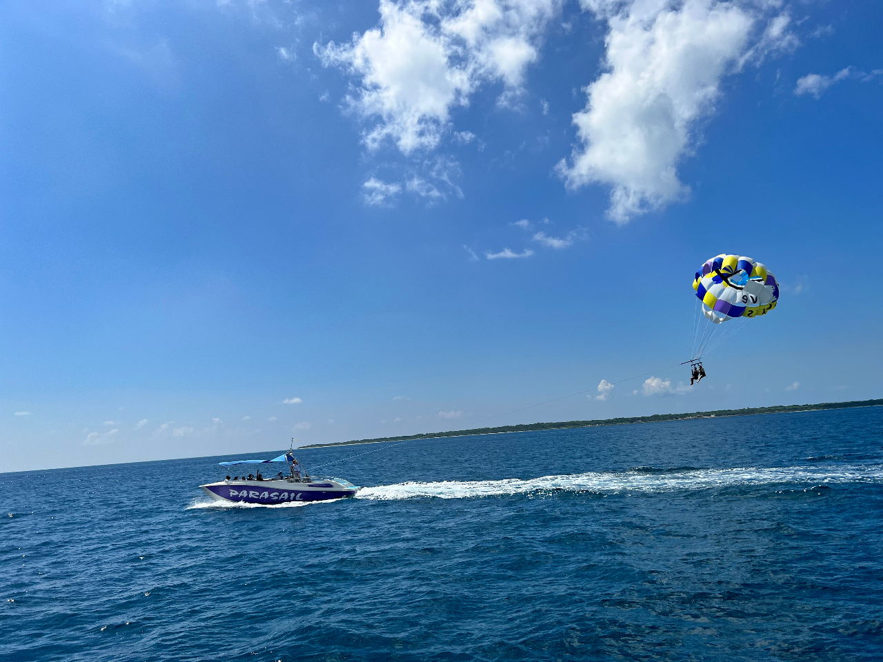 どこまでも続く透き通った海と八重山の島々を上空から見渡せるのはパラセーリングならでは。