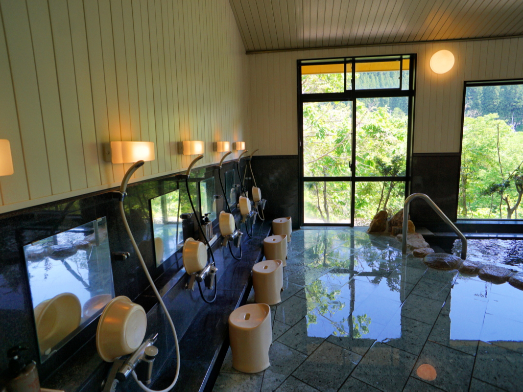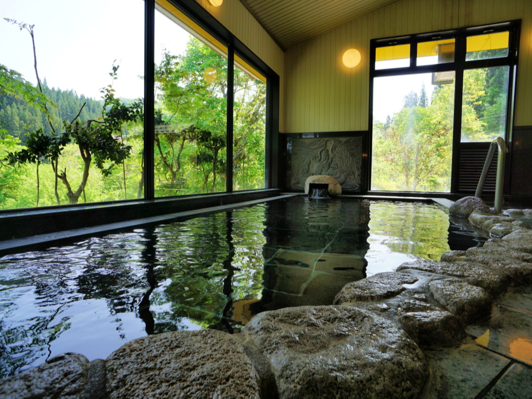 大きな窓は開放的で雄大な眺めが楽しめ、間口いっぱいまでに広がる湯船には明治以前から地元の人たちに愛されてきた「名湯」がたっぷりと満たされています。心なごむひとときをお楽しみ下さい。