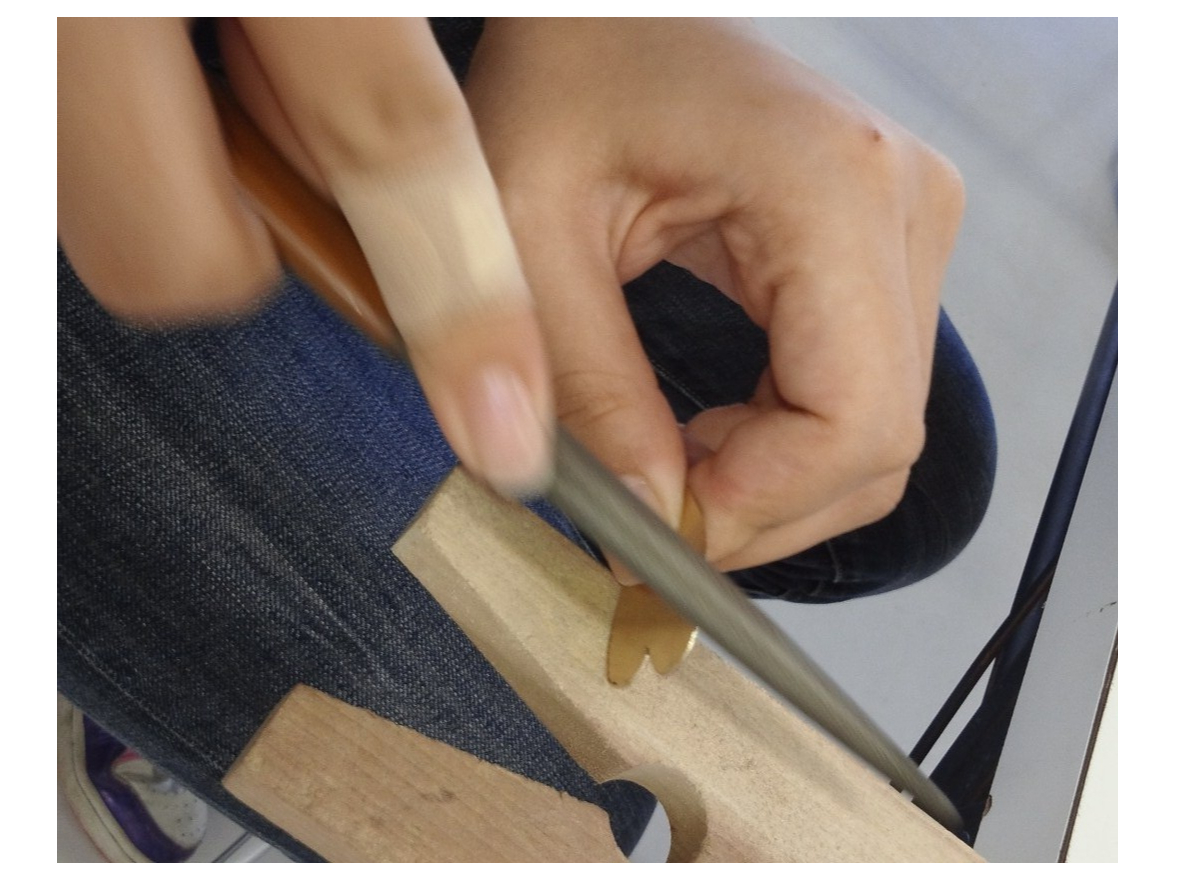 真鍮板の外形をヤスリ掛け・穴を開ける・矢坊主で凹みを作る・曲げる・磨くなど